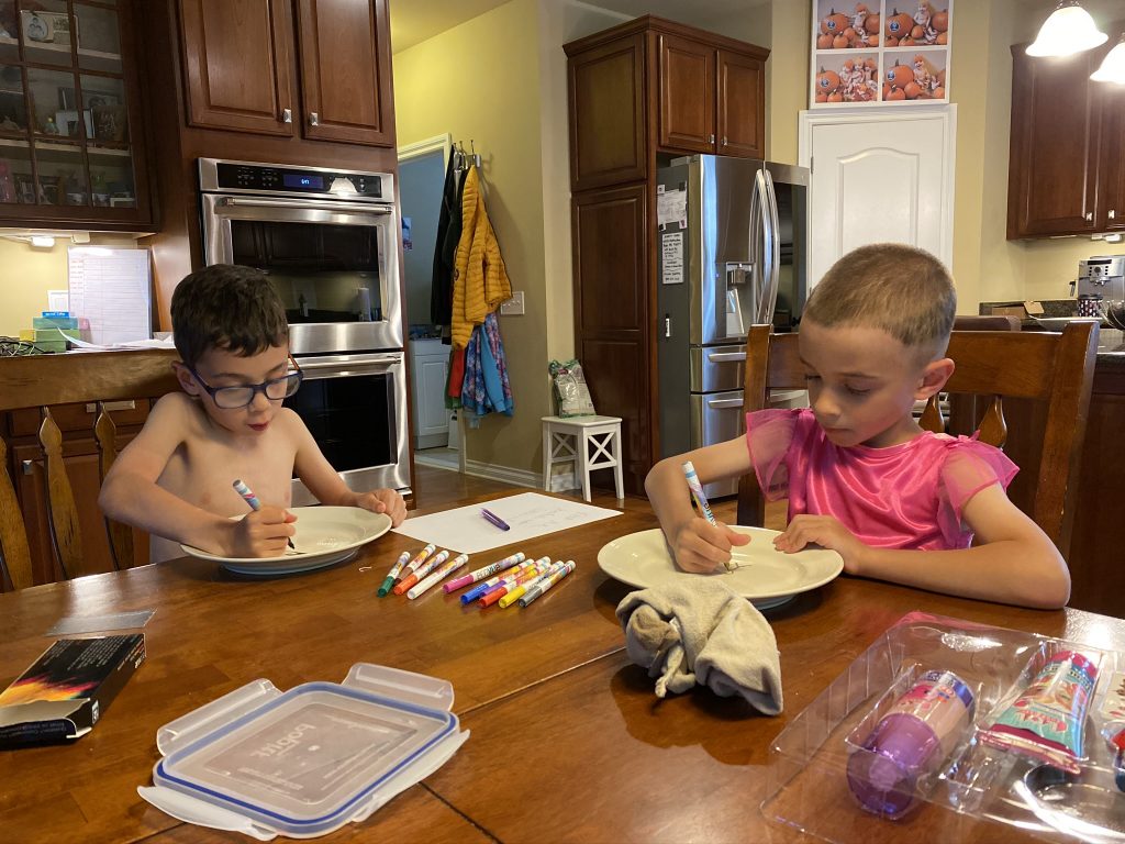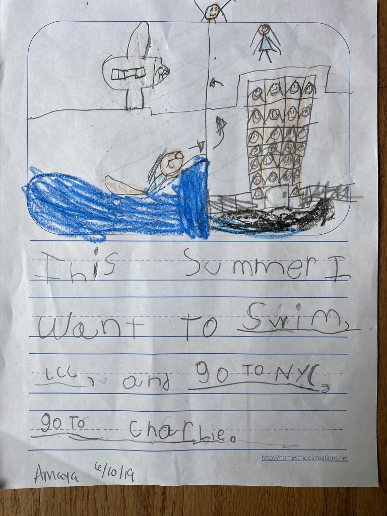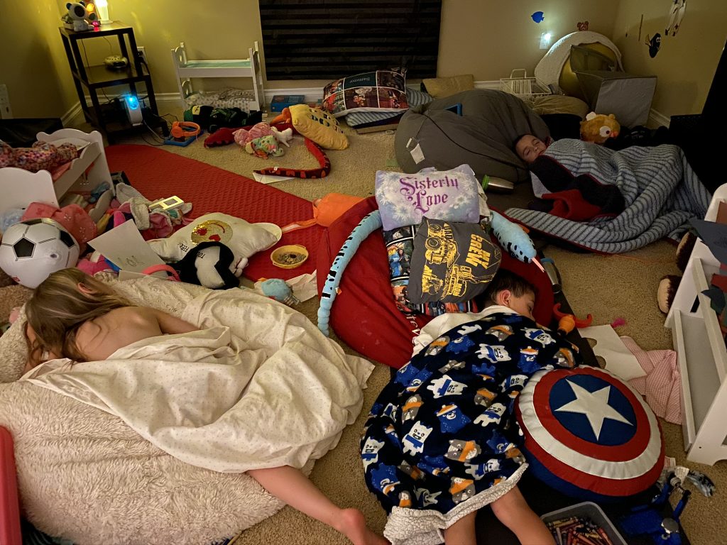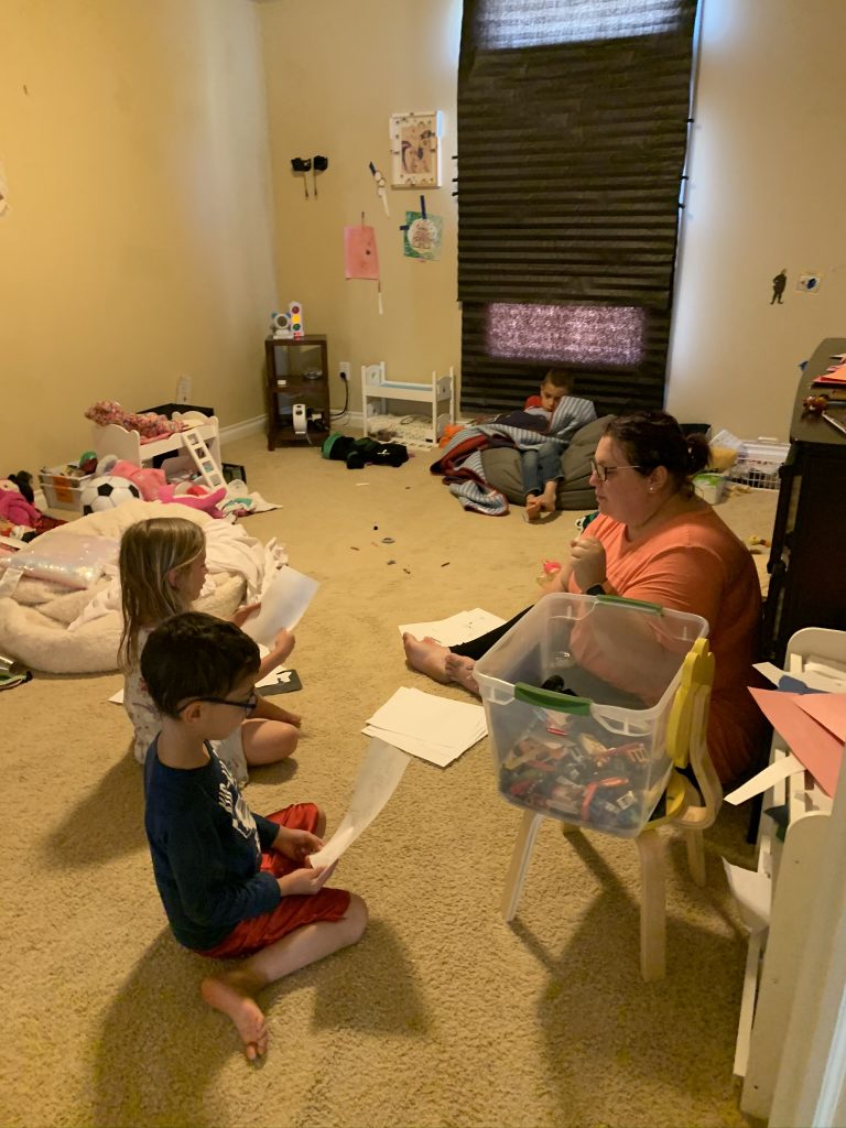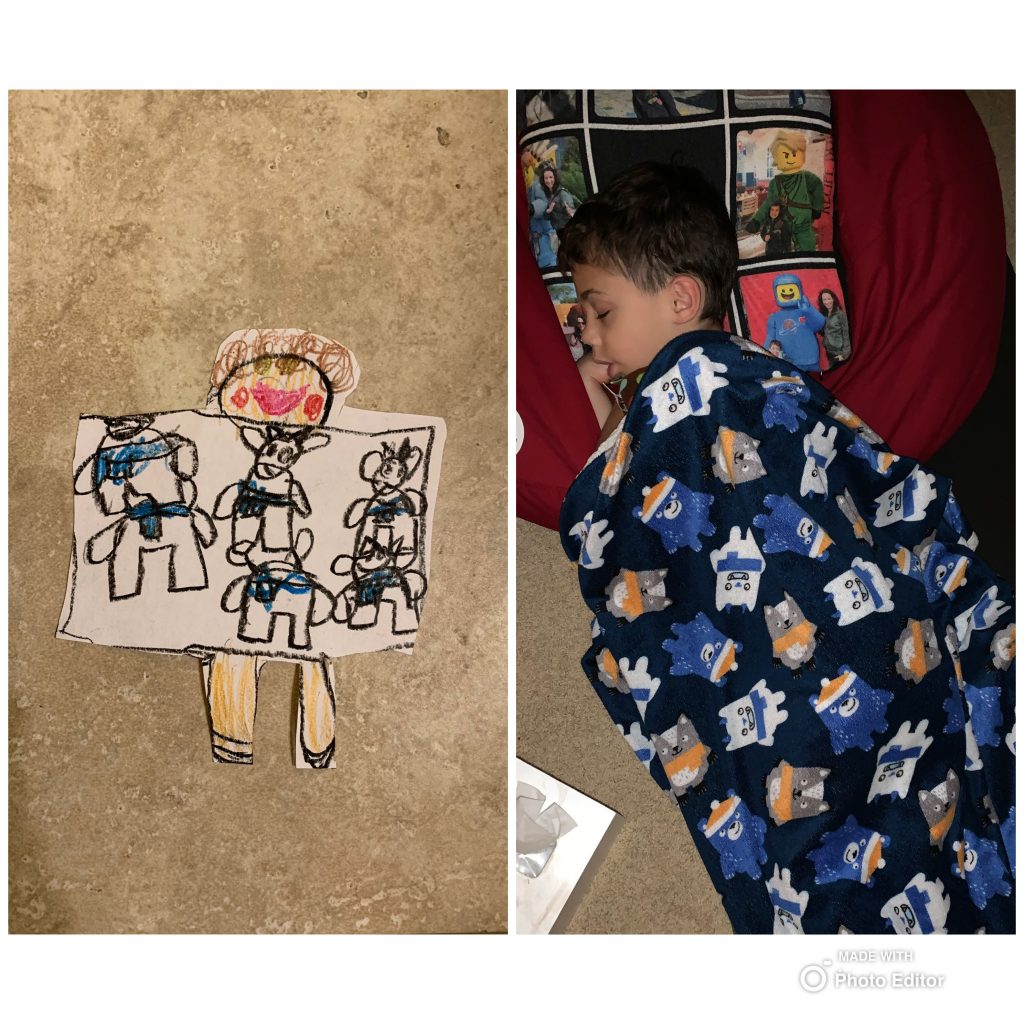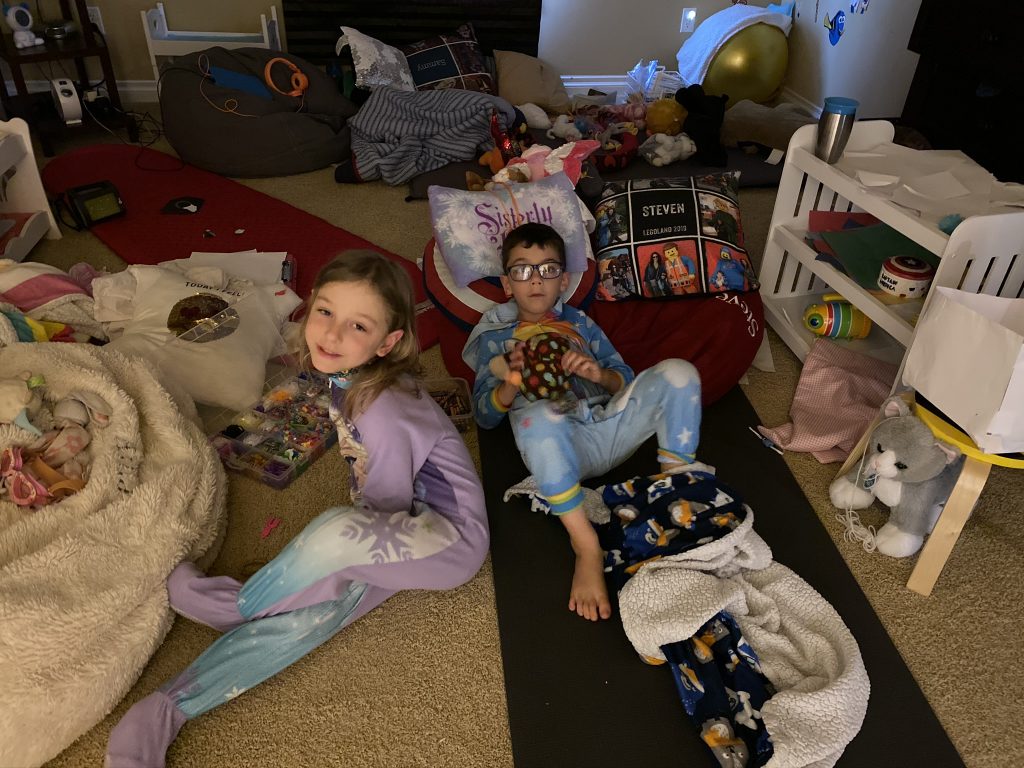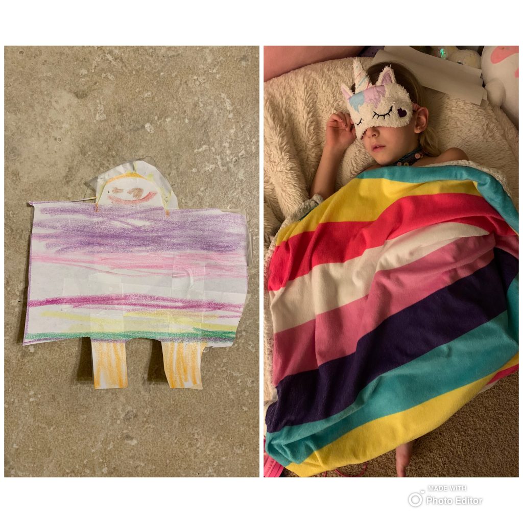 On Saturday night Amaya and Steven were up late, thick as thieves, playing games. When I told them it was time to go to sleep, Amaya started sobbing for Steven. (Even though he’d be sleeping 2 feet away from her.) They hugged it out while she cried and Steven said, “I love you, sis.” Earlier, at bedtime, they drew pictures of each other in bed under their blankets.