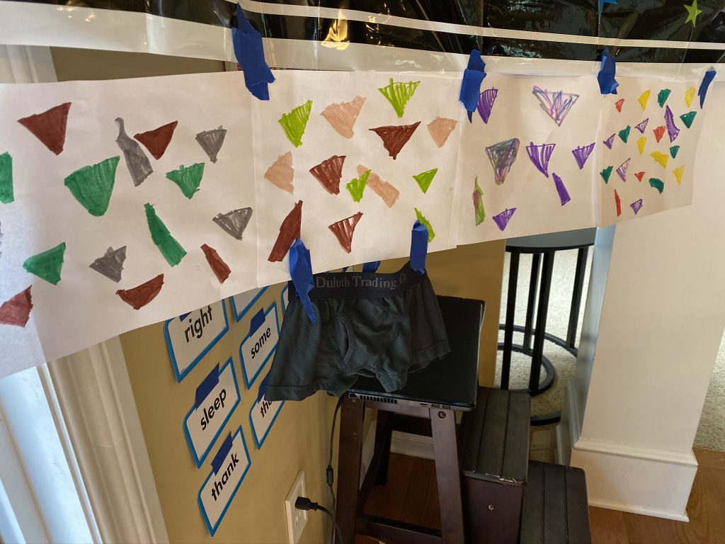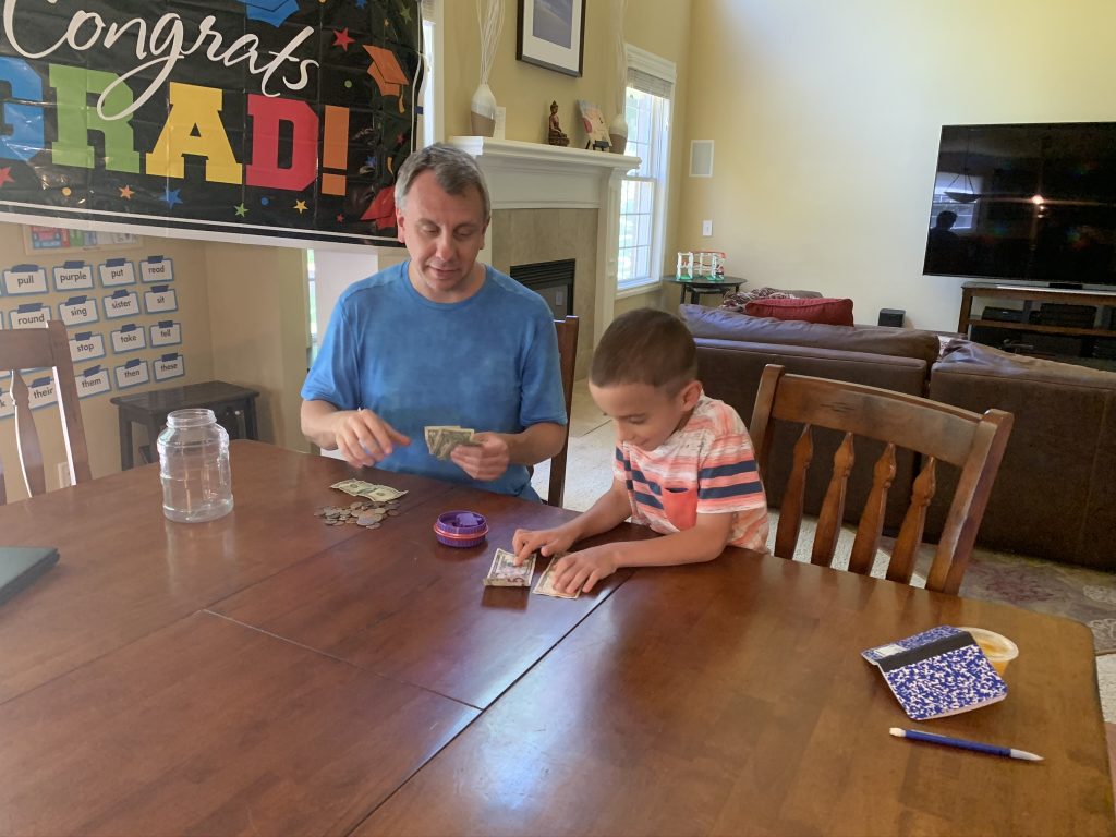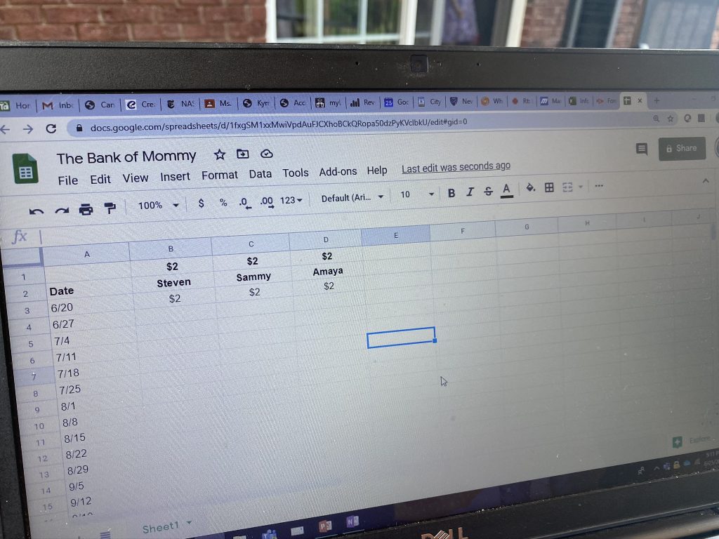 SSA are earning cash dollars for work around the house but, for their responsibilities with Sally, they have accounts at The Bank of Mommy. I’ve marked the Saturdays where they earn their money but they can also make withdrawals or earn money for other tasks. For spending we need to coordinate the totals with their piggy banks but this is the best way to be sure they actually earn the $ due to them on a weekly basis since I’m not usually flush with dollar bills. It also helps them learn about different ways of accounting for their money. This weekend they each earned 2 more dollars. Sammy and Steven have since spent theirs. 🙂