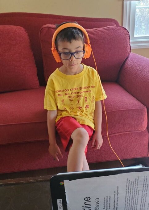 Every now and then the kids sit patiently while I work. Here, Steven had my headset on and was working at his office on his invisible computer.