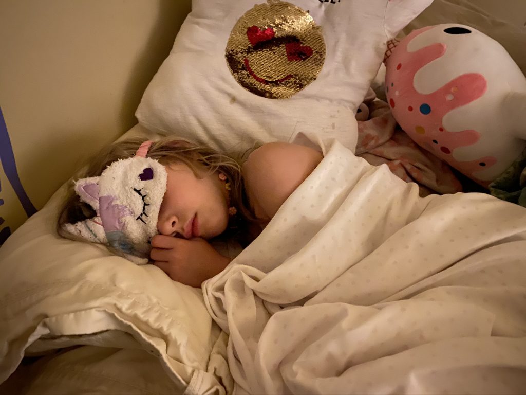 And my girl at bedtime. Fast asleep in that precious sleep mask, homemade pillow by her side.