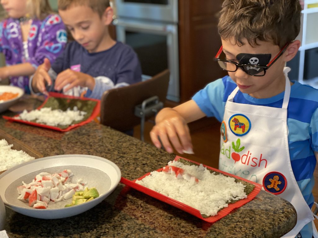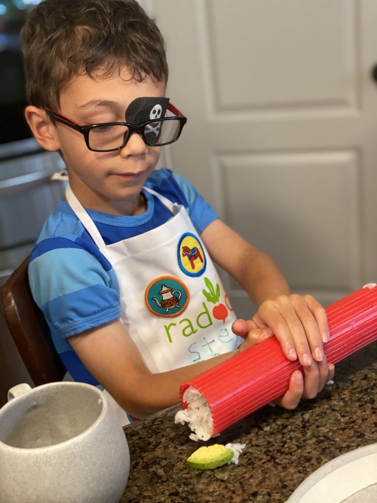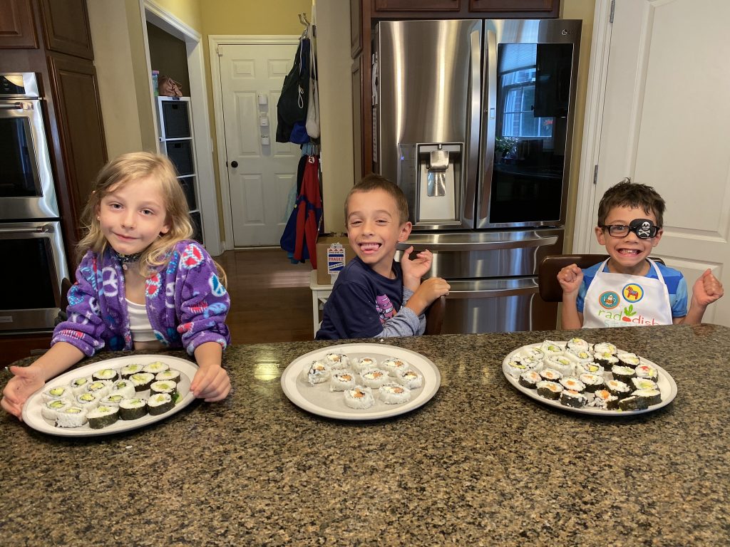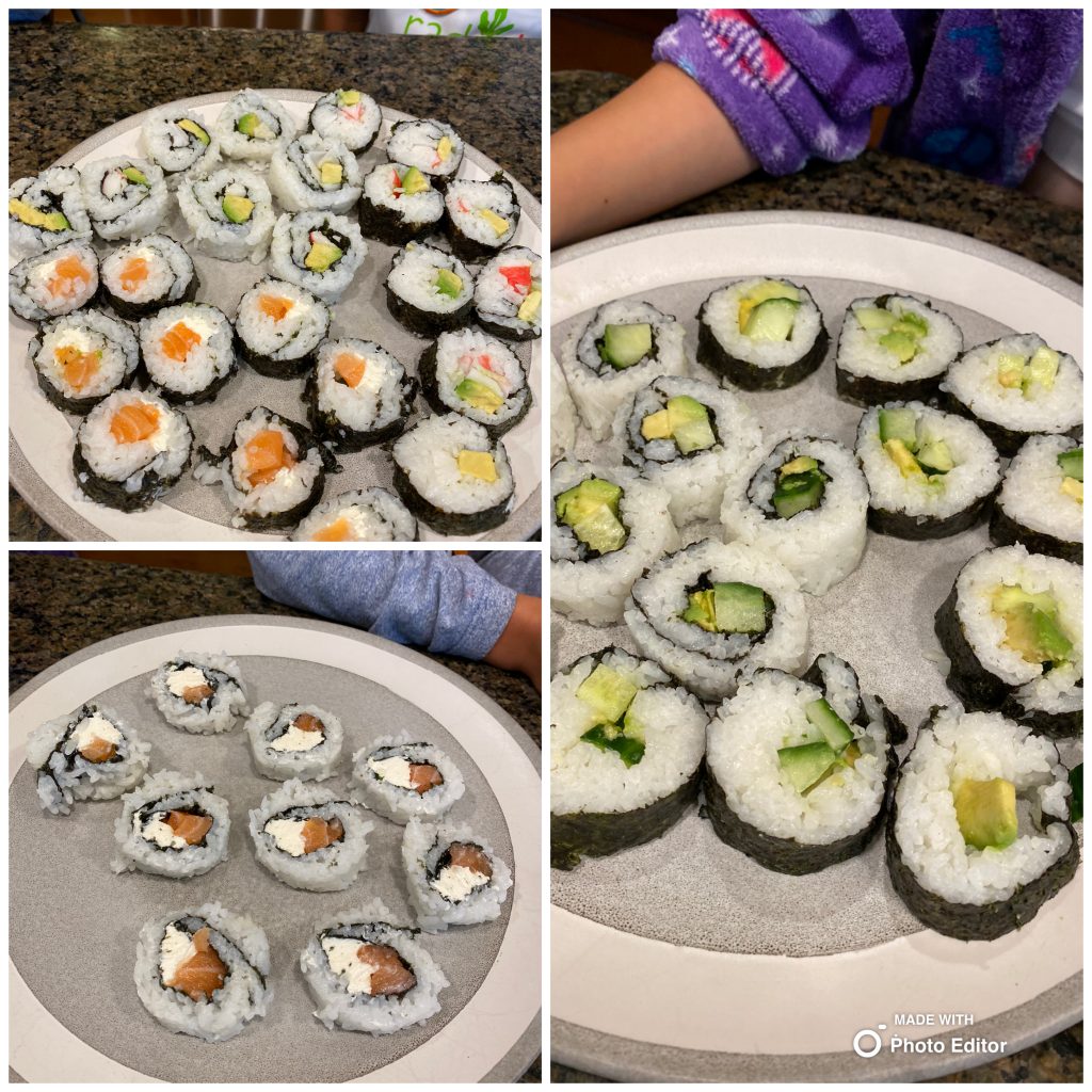 We had so much fun and it was a really interesting process for all of us. We got supplies so the kids could make the sushi they’re used to eating. Cucumber avocado rolls for Amaya. Philadelphia rolls for the boys, made by Sammy, and California rolls for the boys, made by Steven.