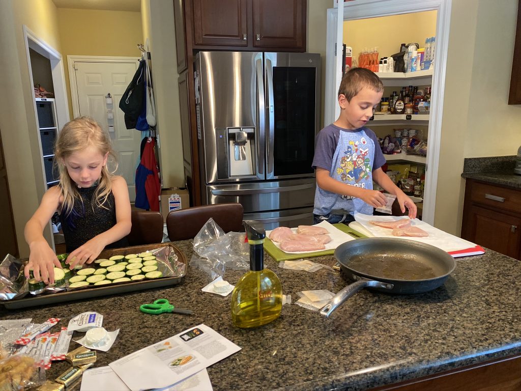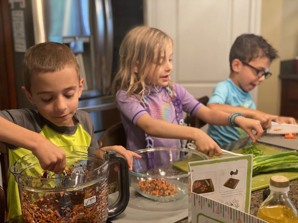 They cut the vegetable and fish, put the rice on their mats and placed the ingredients. I added some support with the rolling and cutting the finished rolls. We’re used to inside out rolls, which wasn’t how the instructions were written, so I was happy that we figured out how to simply reverse the rice and seaweed to make the rolls the way we prefer.