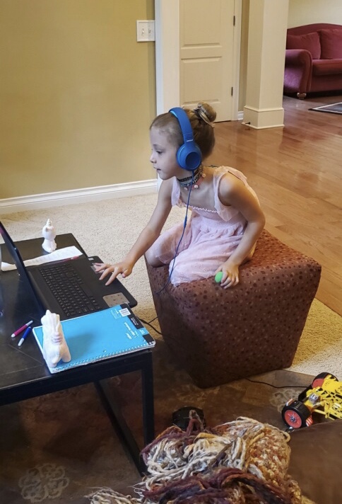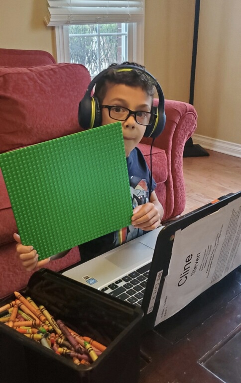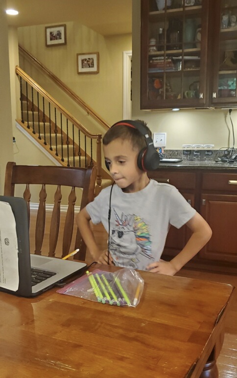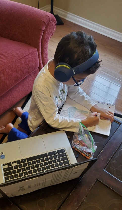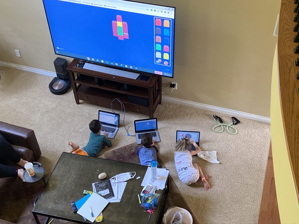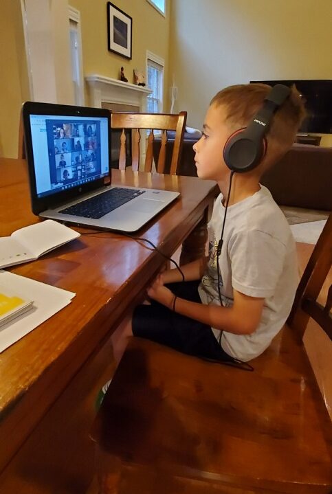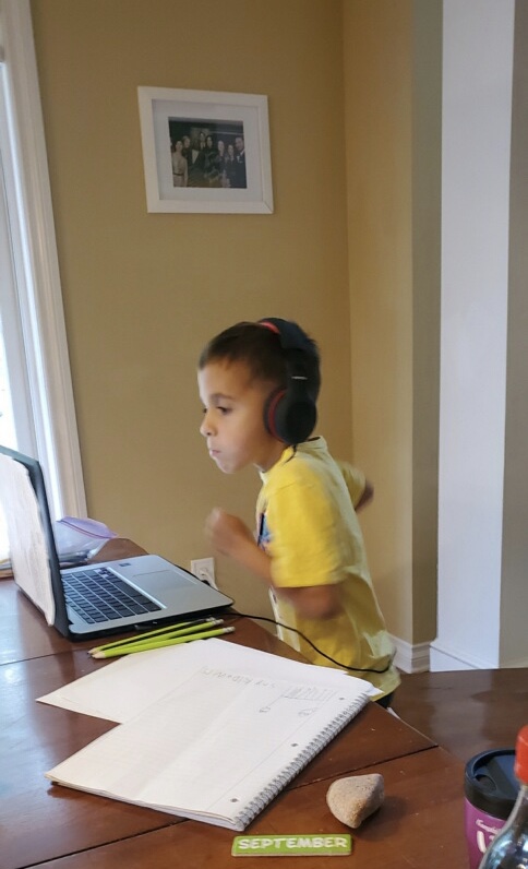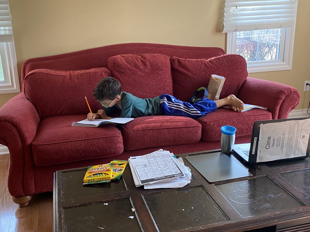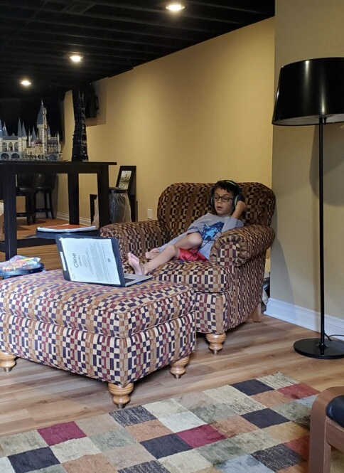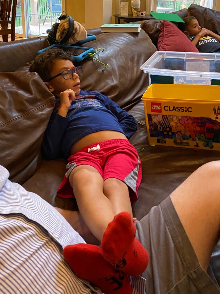 The rule is that the kids have to sit up properly for their live, synchronous learning time but they have more flexibility during independent working time – as long as they stay focused and get their work done. I was able to sneak this picture when I came down to get a snack.