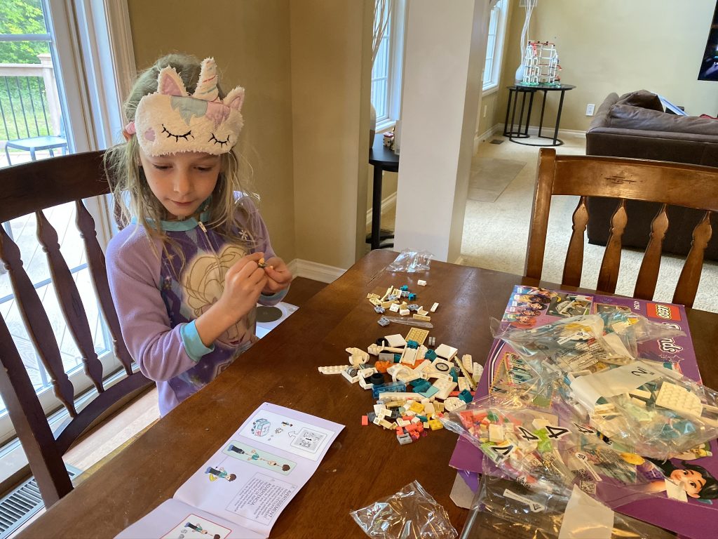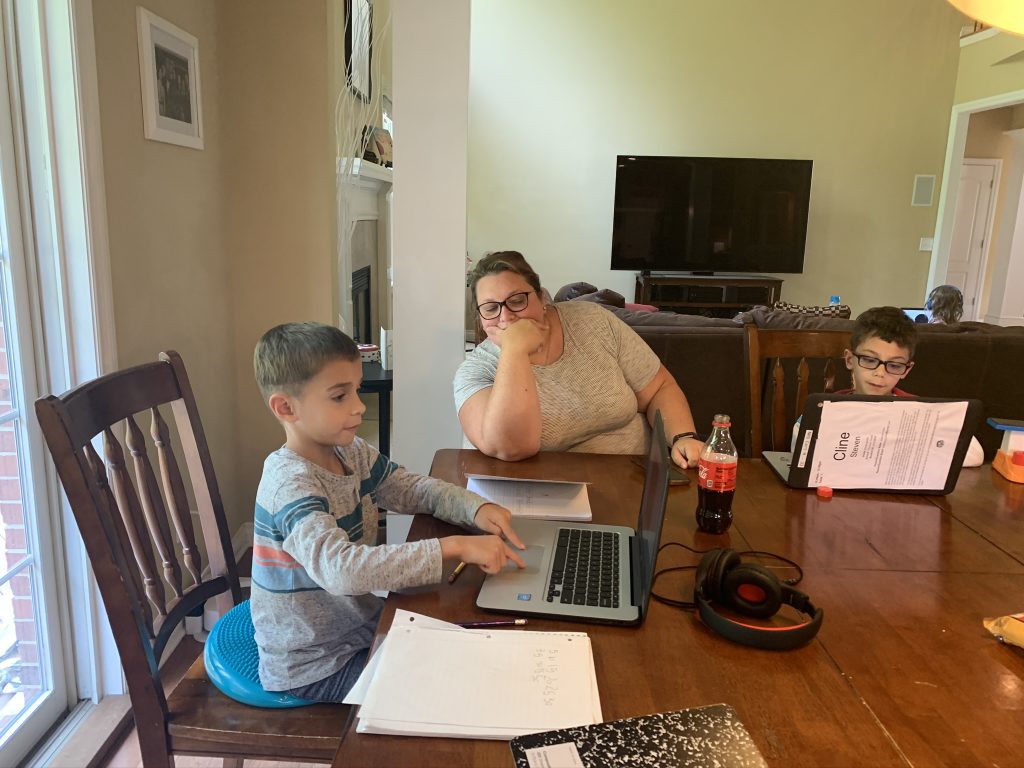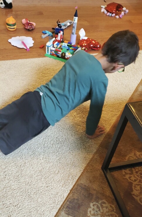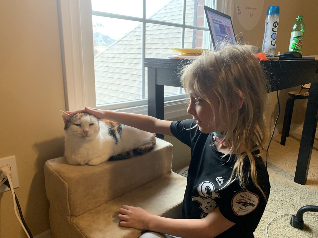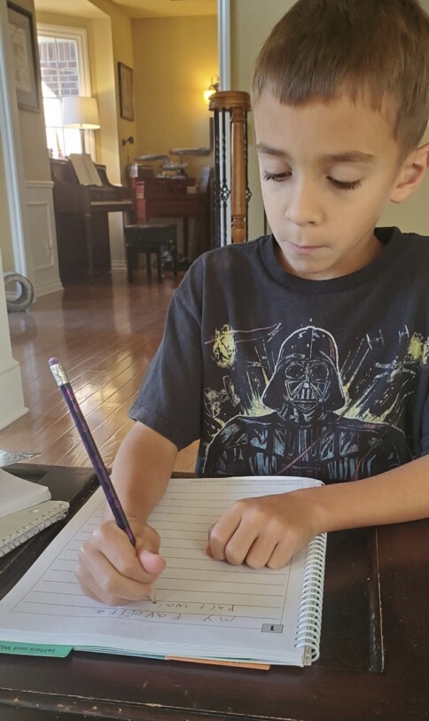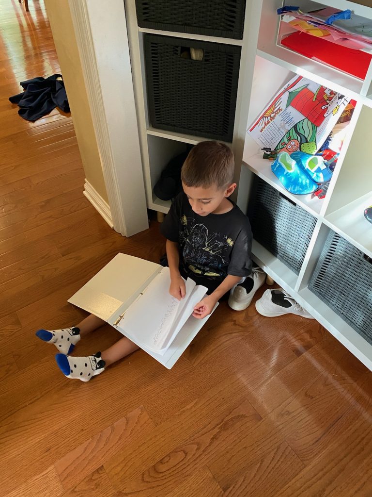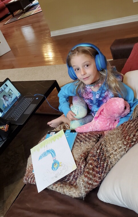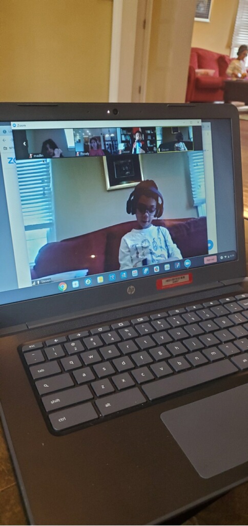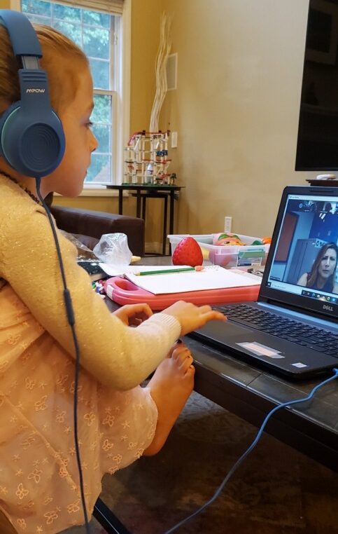 The rule is that the kids have to sit up properly for their live, synchronous learning time but they have more flexibility during independent working time – as long as they stay focused and get their work done. I was able to sneak this picture when I came down to get a snack.