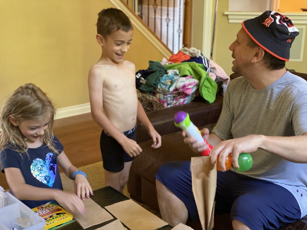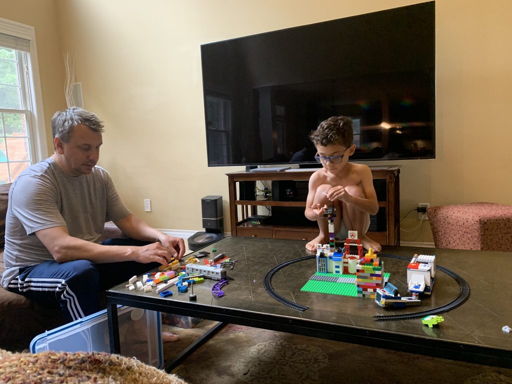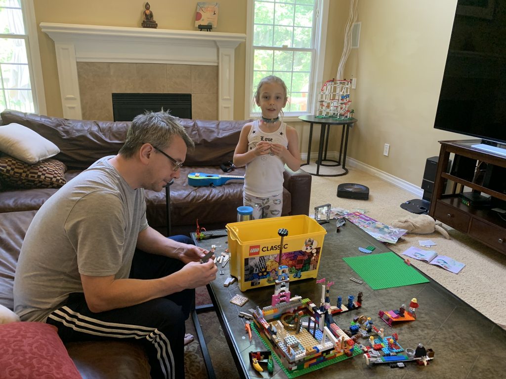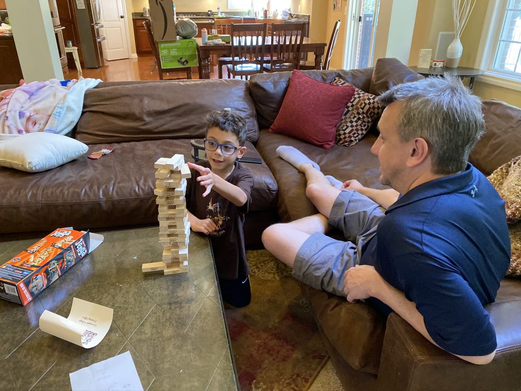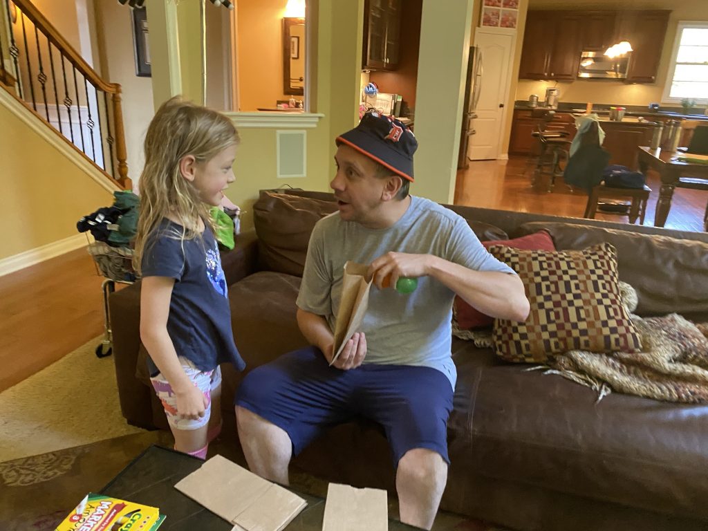 Today, for reasons that make great sense in the minds of the Cline kids, was National Sports Day and National Dads Day. (Different from Father’s Day which isn’t national, you see. And on National Dads Day, dads don’t get to sleep late.) The kids celebrated with activity stations around the house. Sammy set up a book-making station. Amaya set up a puppet making station. Steven set up a ball card and Jedi dueling station. On National Dad’s Day you also eat cake. So there was cheesecake.