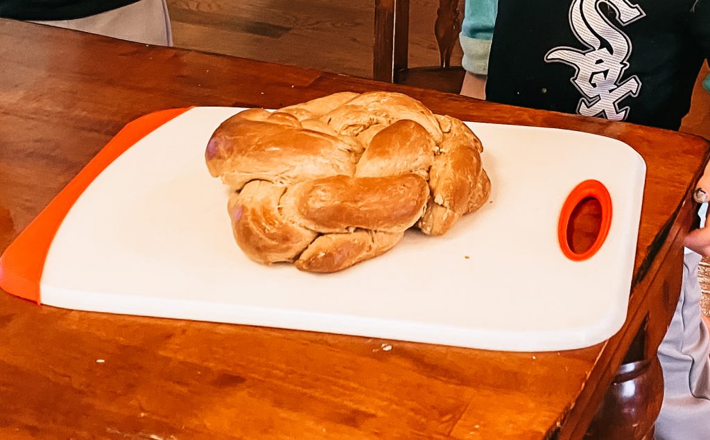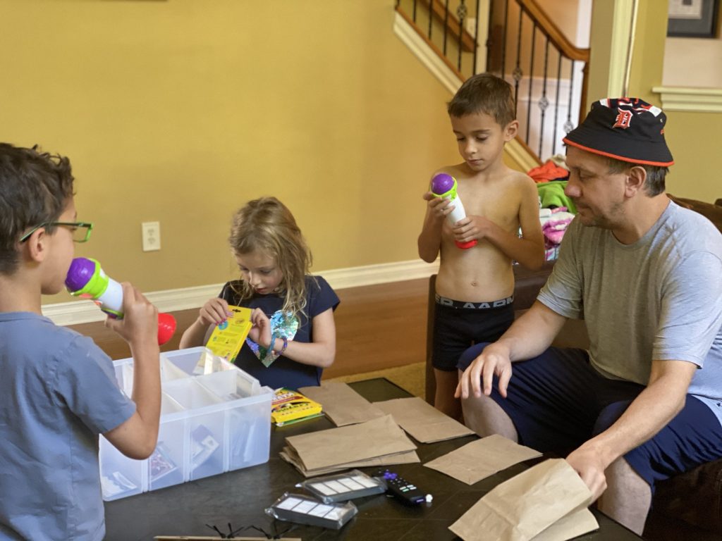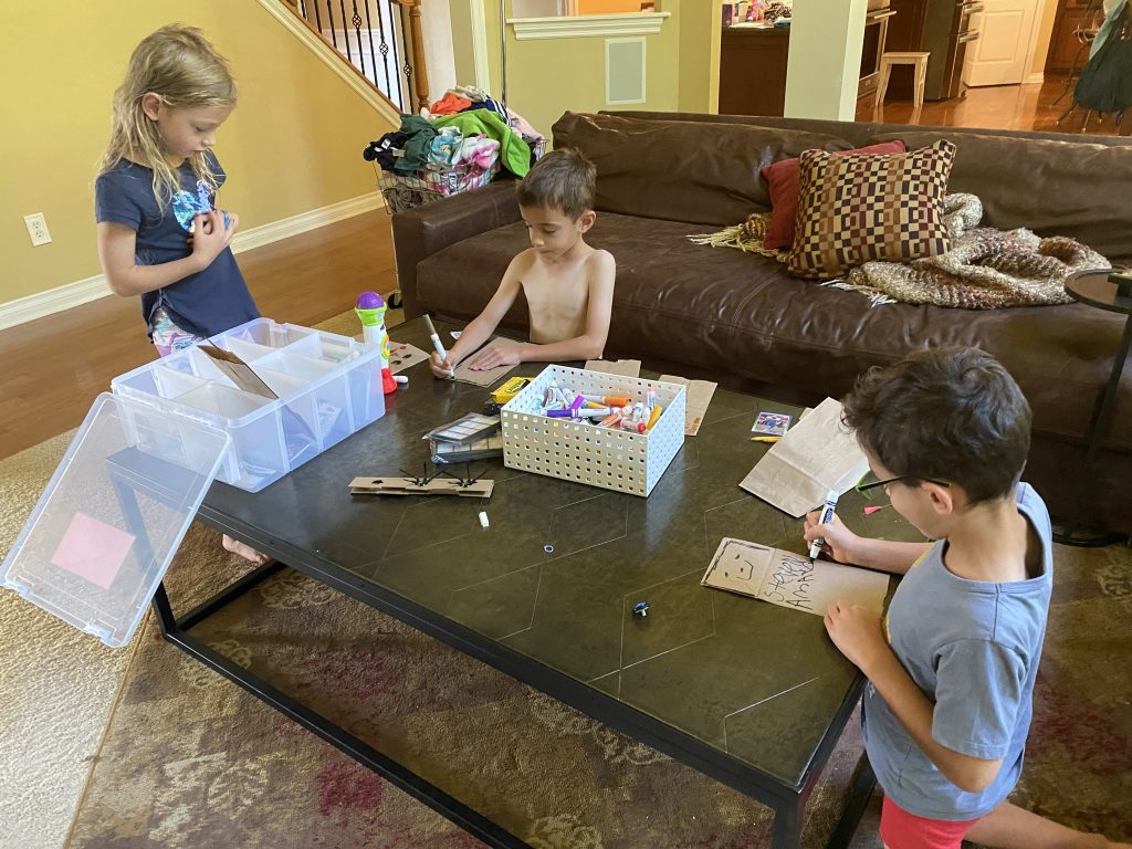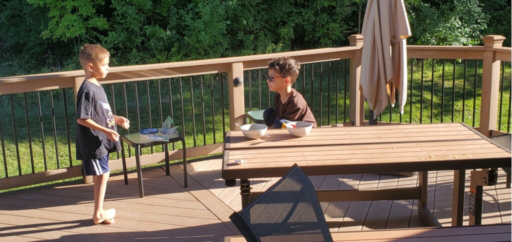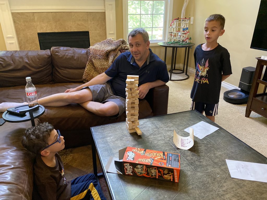 Today, for reasons that make great sense in the minds of the Cline kids, was National Sports Day and National Dads Day. (Different from Father’s Day which isn’t national, you see. And on National Dads Day, dads don’t get to sleep late.) The kids celebrated with activity stations around the house. Sammy set up a book-making station. Amaya set up a puppet making station. Steven set up a ball card and Jedi dueling station. On National Dad’s Day you also eat cake. So there was cheesecake.