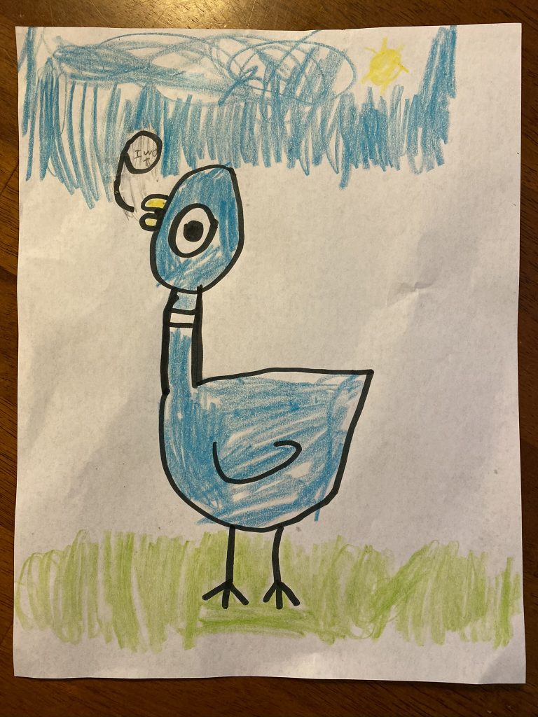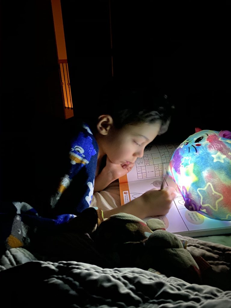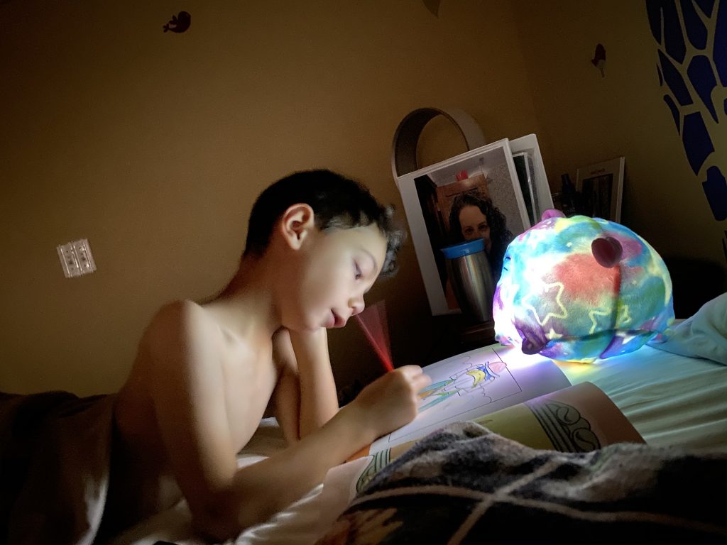 Steven has a Mo Willems art book that has resurfaced as a recent favorite. He uses Light Cat, a gift from Charlie, to light his way when he’s doing his art in the early morning hours (in our bed).