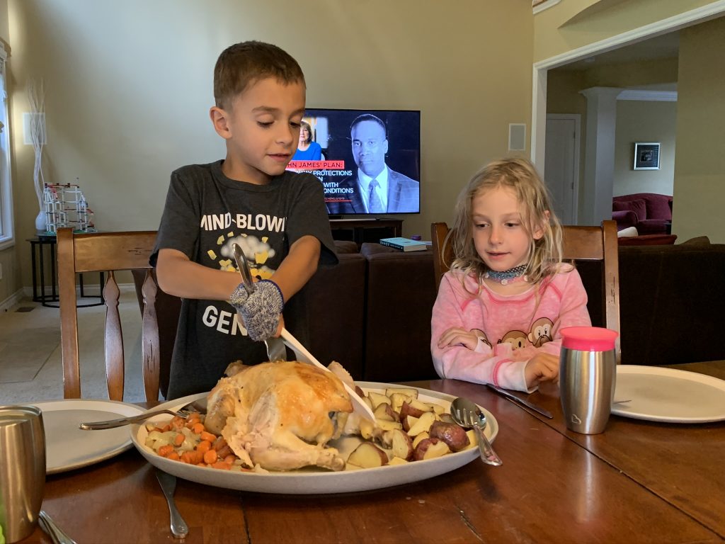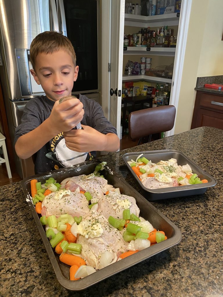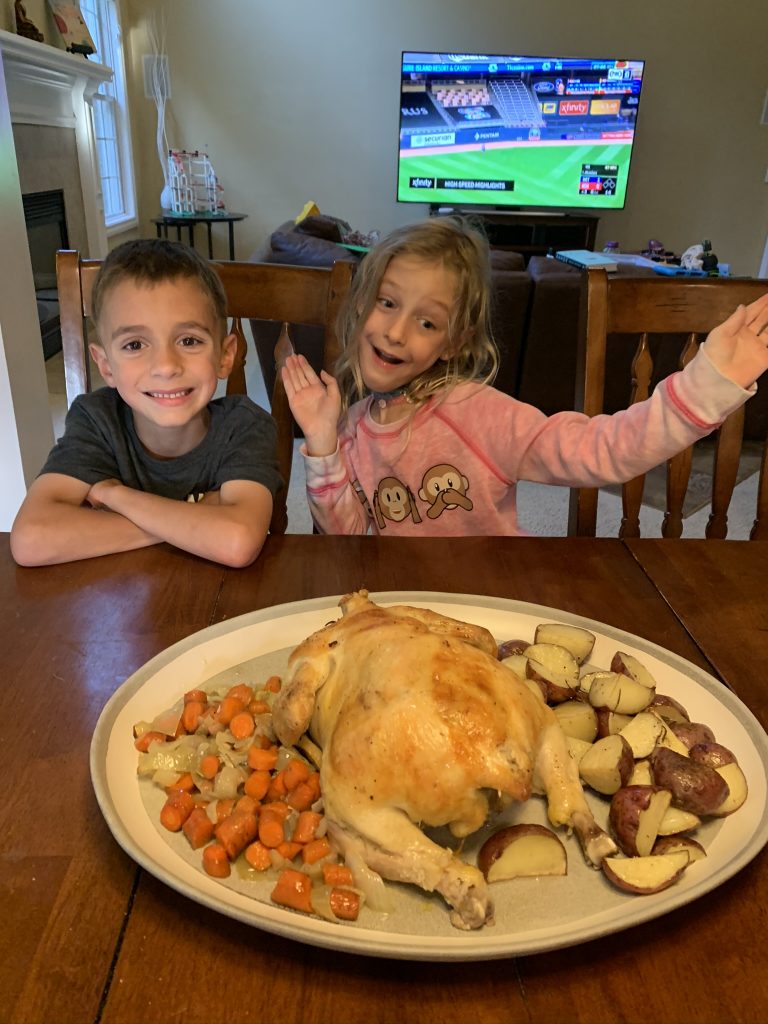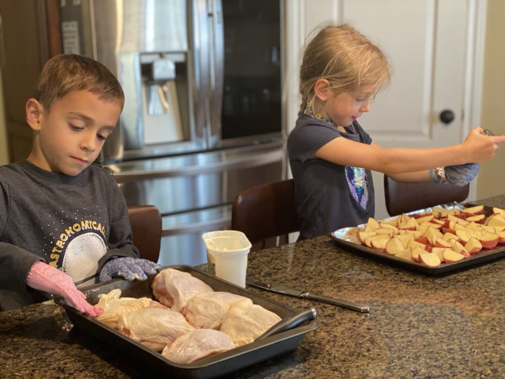 We wrapped up the day with chicken and potatoes ala Amaya and Sammy. Amaya washed, cut and seasoned the potatoes. I just added some salt and put them in the oven. Sammy prepped and seasoned the chicken all on his own, and to his own desire. Again, I just added salt (and cut the onions). We have amazing chefs.