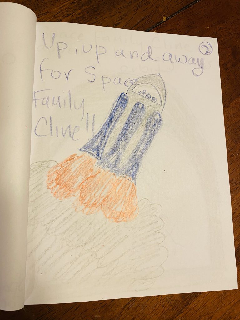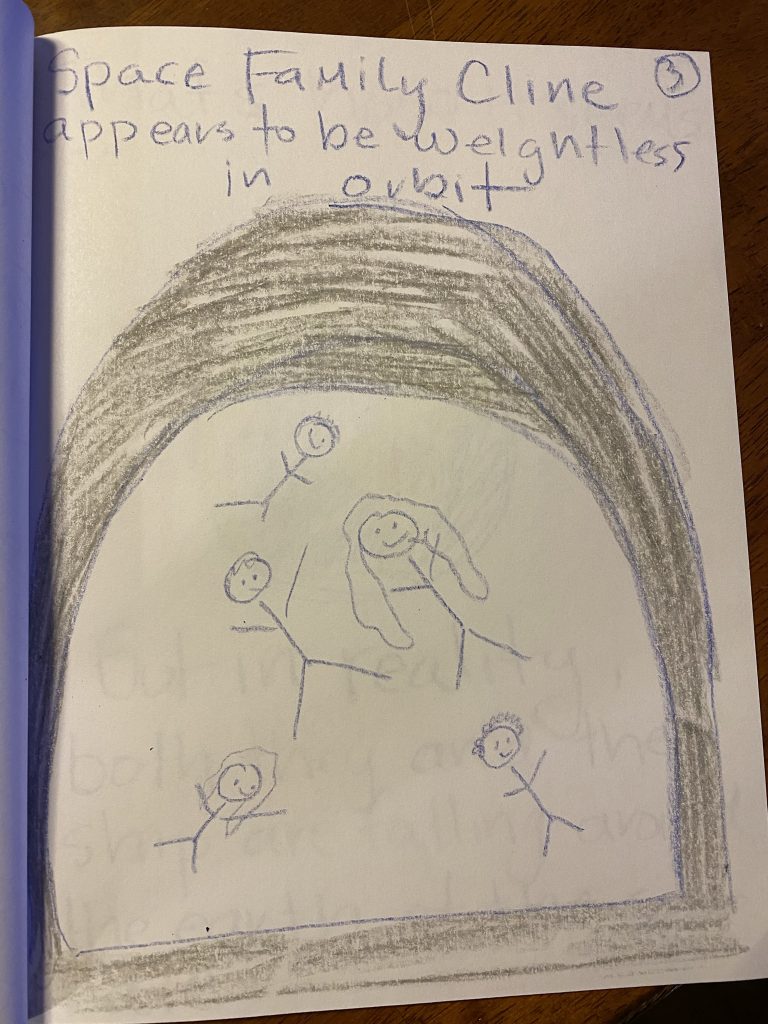 Space Family Cline boards the rocket ship. Up, up and away for space, Family Cline! Space Family Cline appears to be weightless in orbit. That’s how it seems… but in reality, both they and the ship are falling around the earth at the same rate. To come back to early, Space Family Cline fires rockets to slow their horizontal speed. And so, instead of falling around the earth, the fall toward the earth… So they can come home to the land of… Cheltenham. <3″