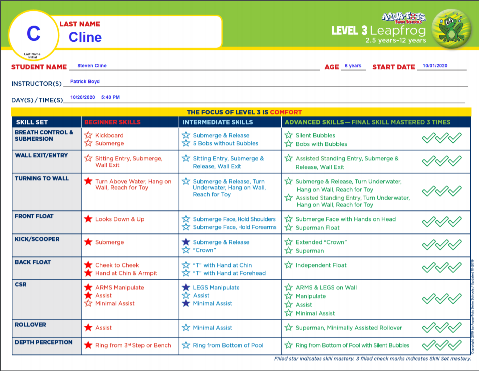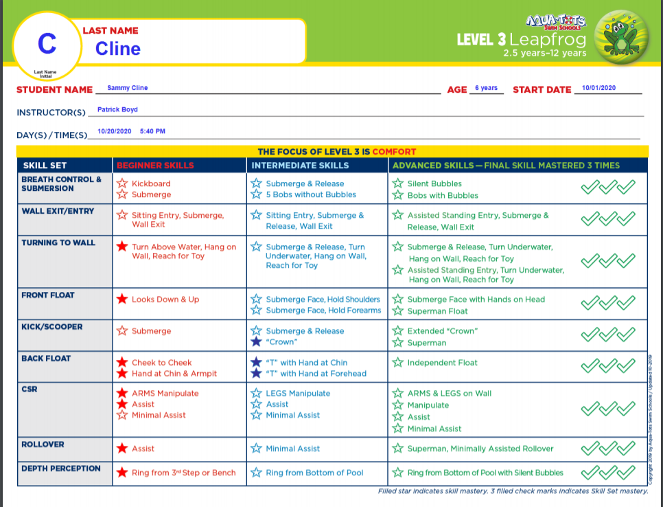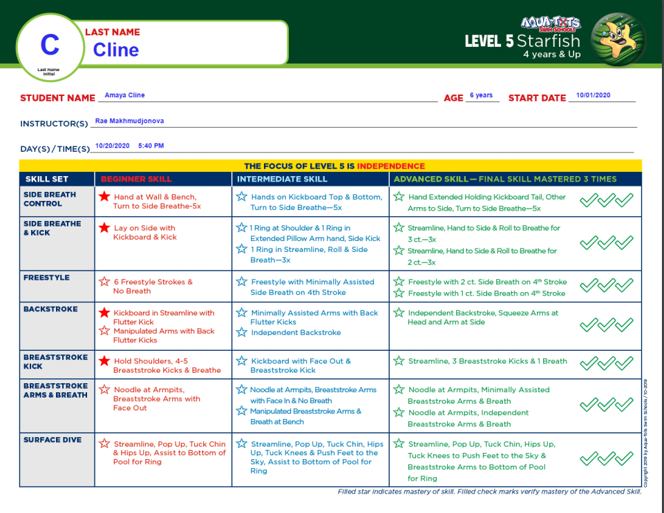 Tuesday SSA were back to swim. After each lesson we get an email with these progress cards. I like to see the skills they’ll master. Amaya started with 0 stars over the course of her first few lessons so its cool to see her progress. I thought level 5 is a little advanced for her but she’s working so hard and making progress.