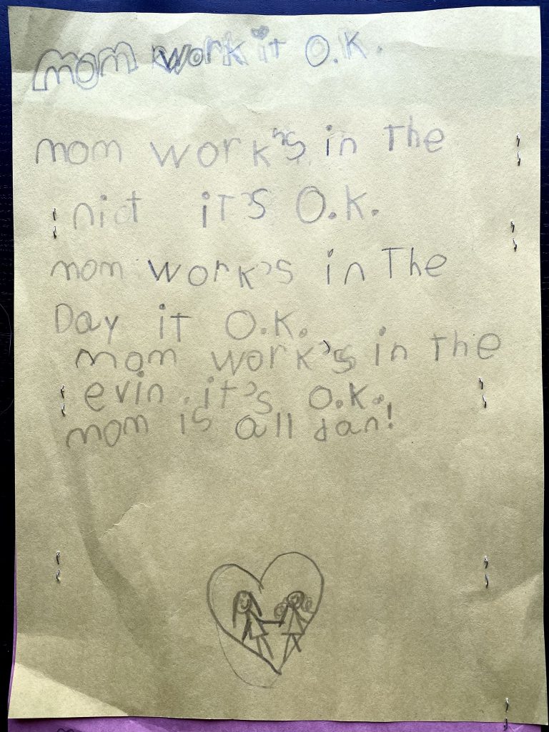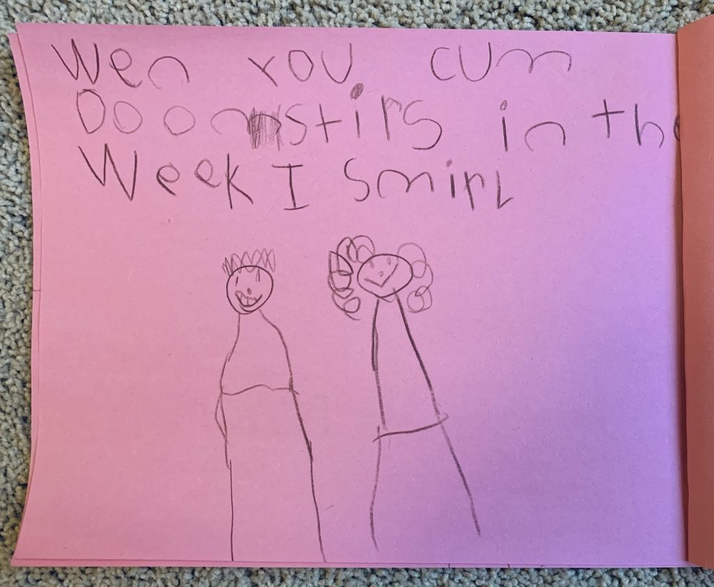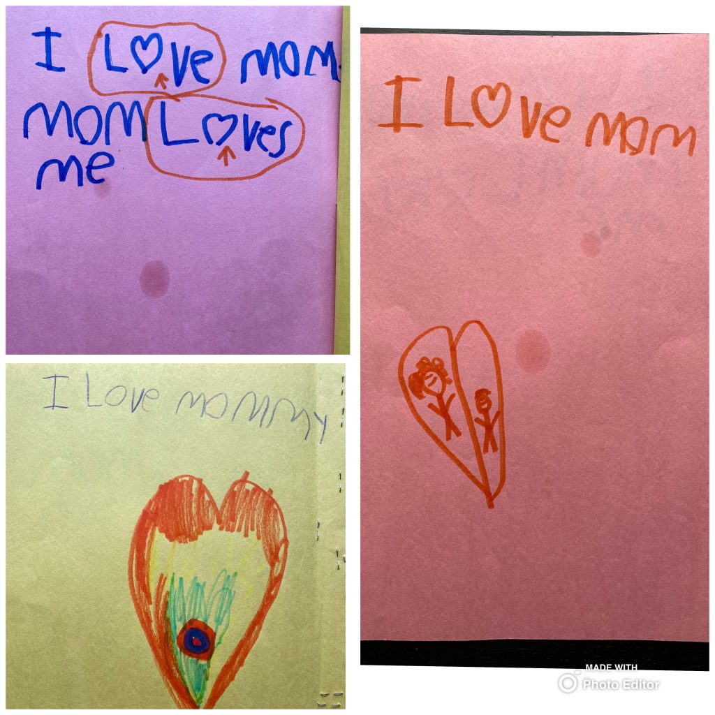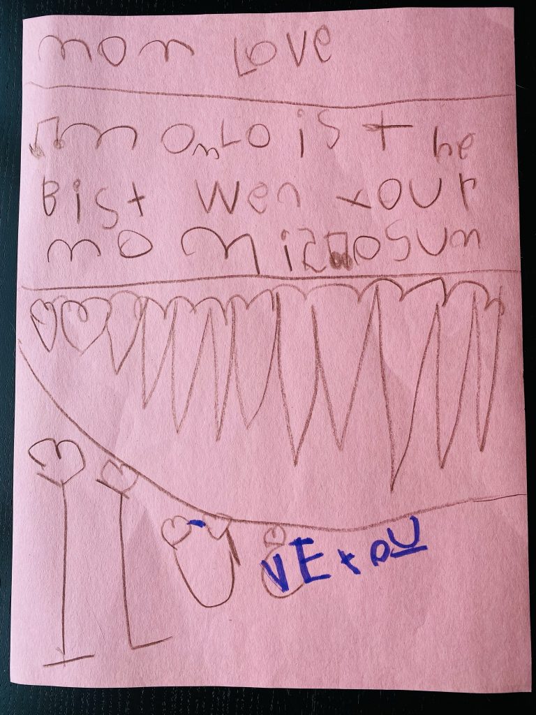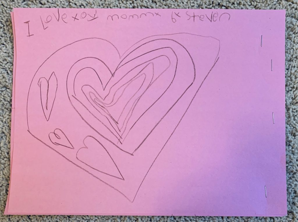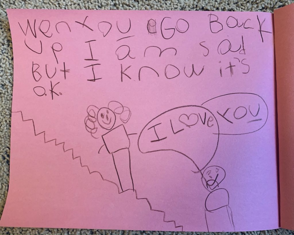 “I Love You, Mommy by Steven. When you come downstairs in the week I smile. When you go back up I am sad but I know it’s ok.”