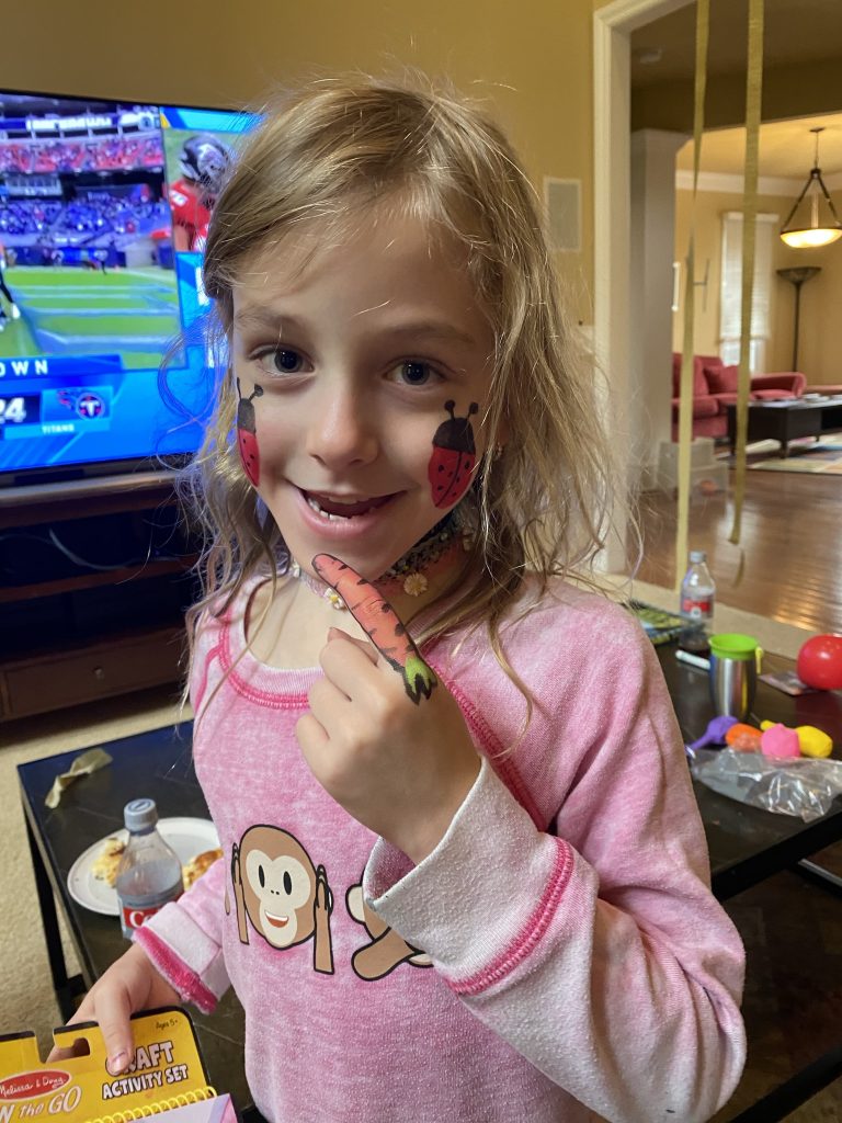 I took a shot at face painting. I can’t get as elaborate as Jason but managed some ladybugs and a finger carrot. 🙂