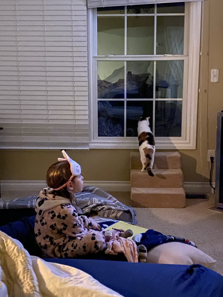 Amaya thought to bring in Sally’s stairs so she could look out the window.