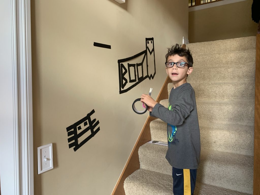 Steven used black painters tape for his decorations. He’d want you to know that the ghost has a “word bubble” to say “Boo”.
