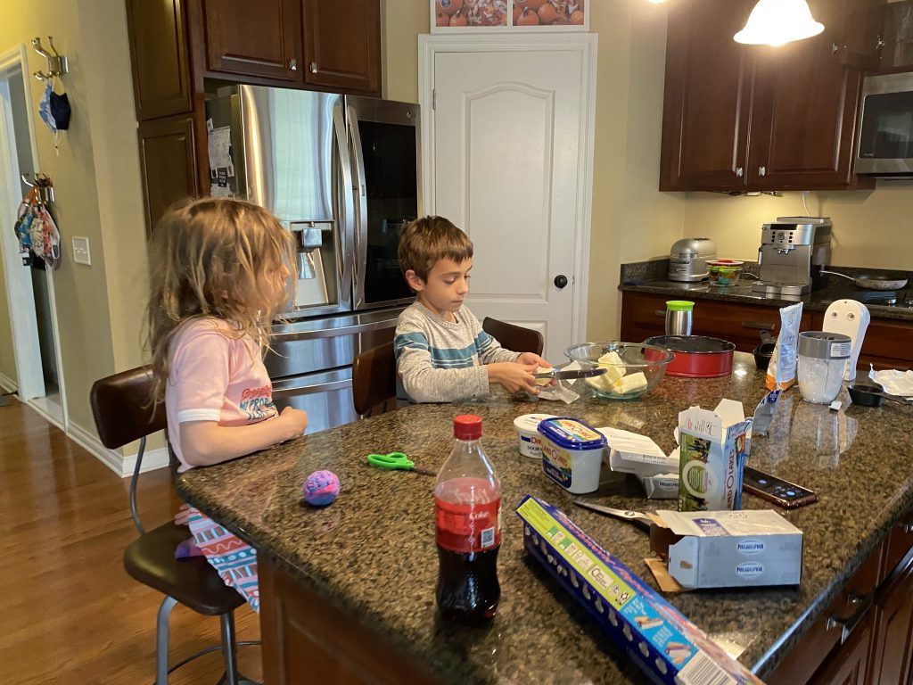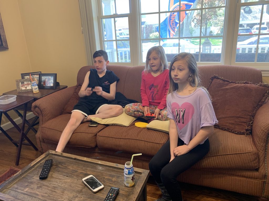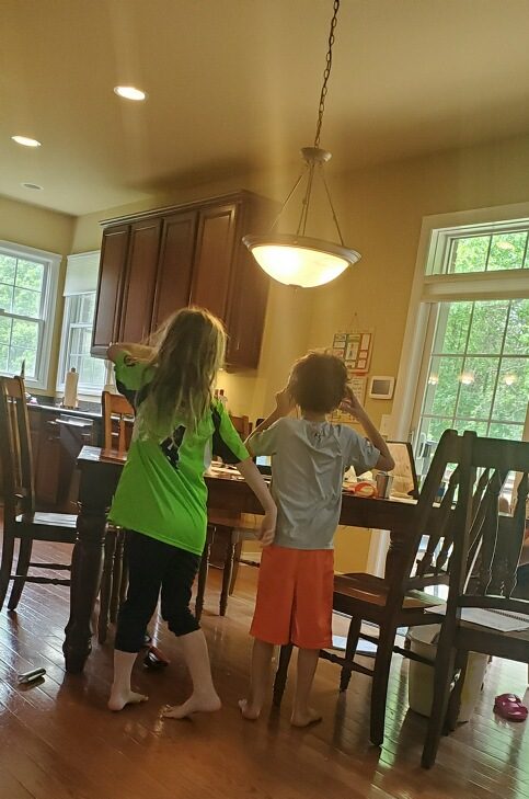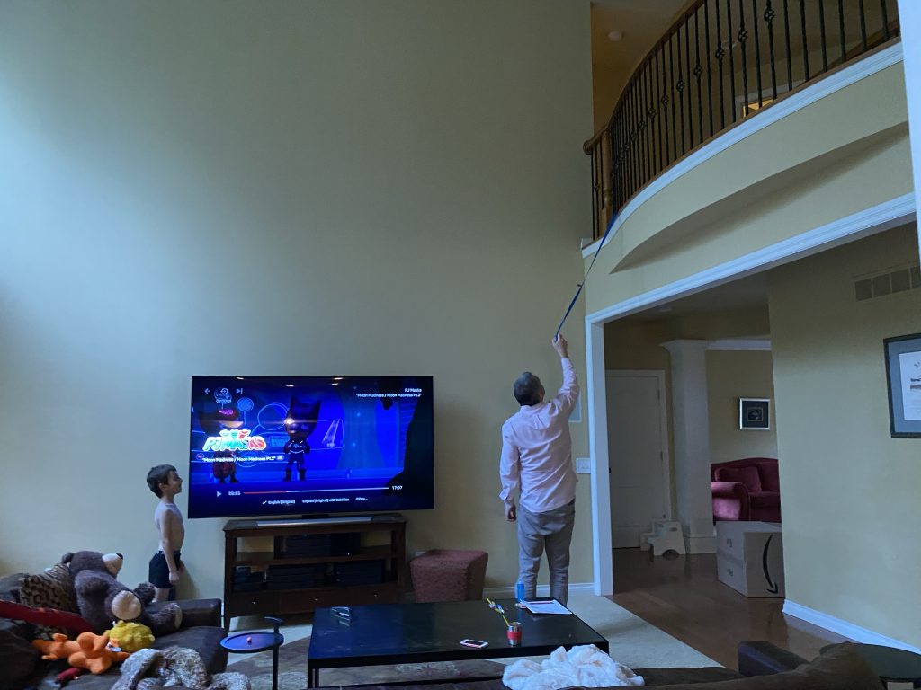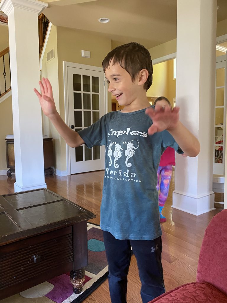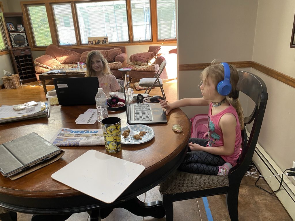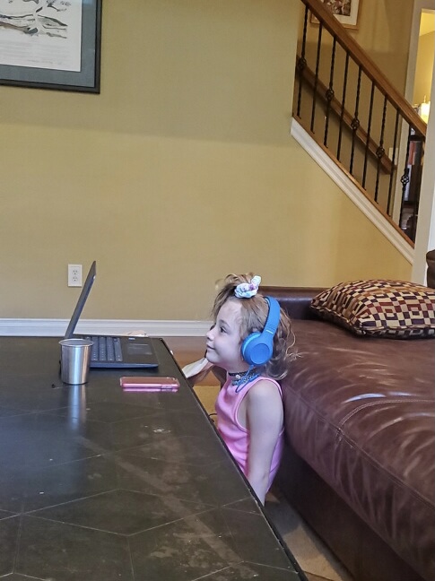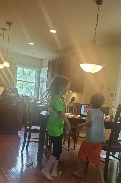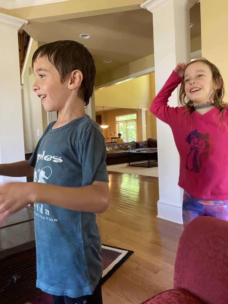 The kids have live PE classes in the house and, sometimes, they do them together. I appreciate the effort on behalf of the school but, honestly, on a nice day I’d prefer to just push the kids outdoors.