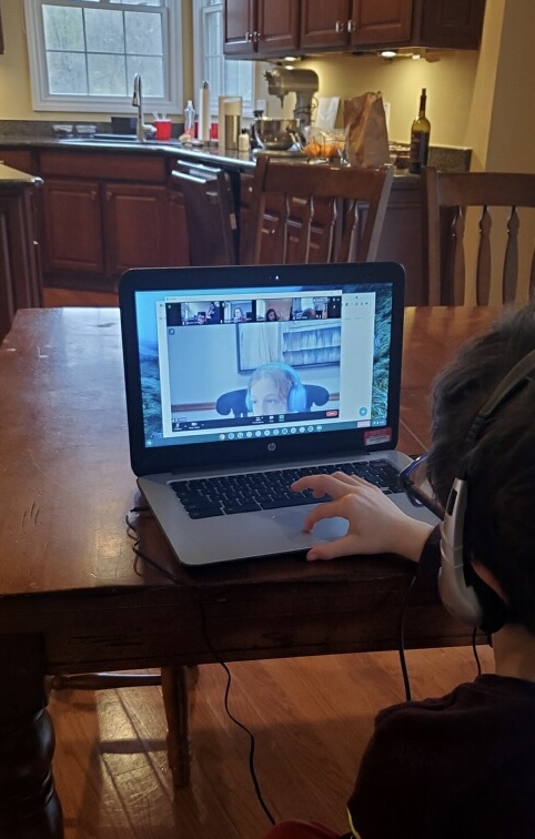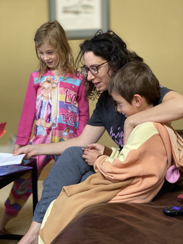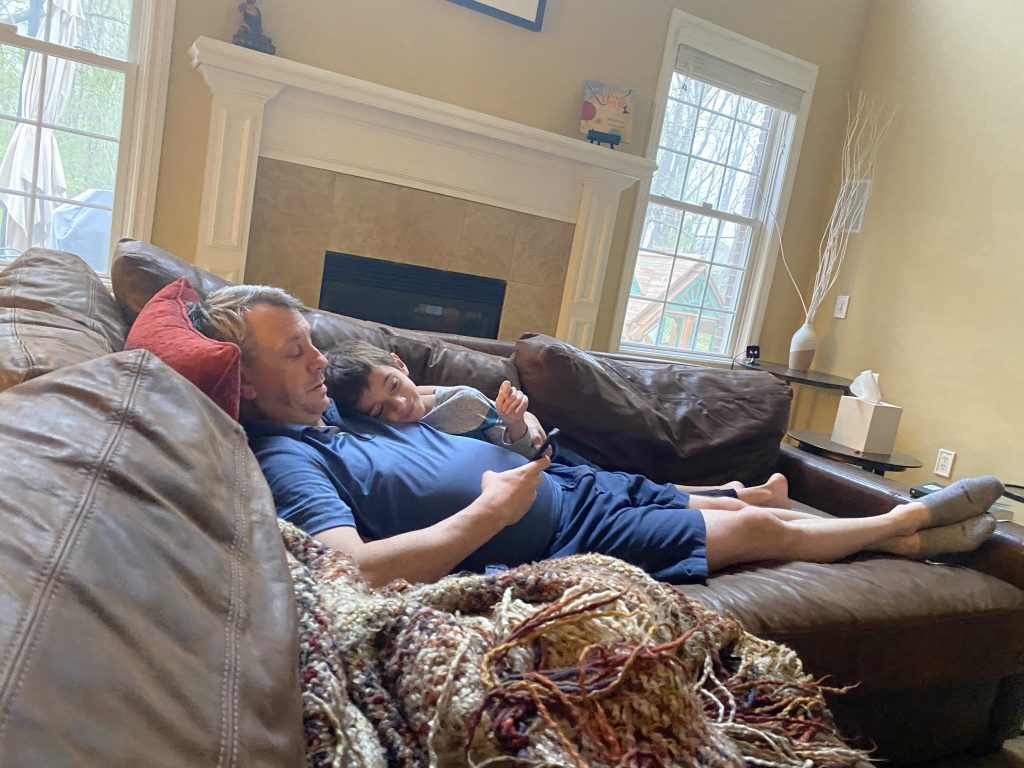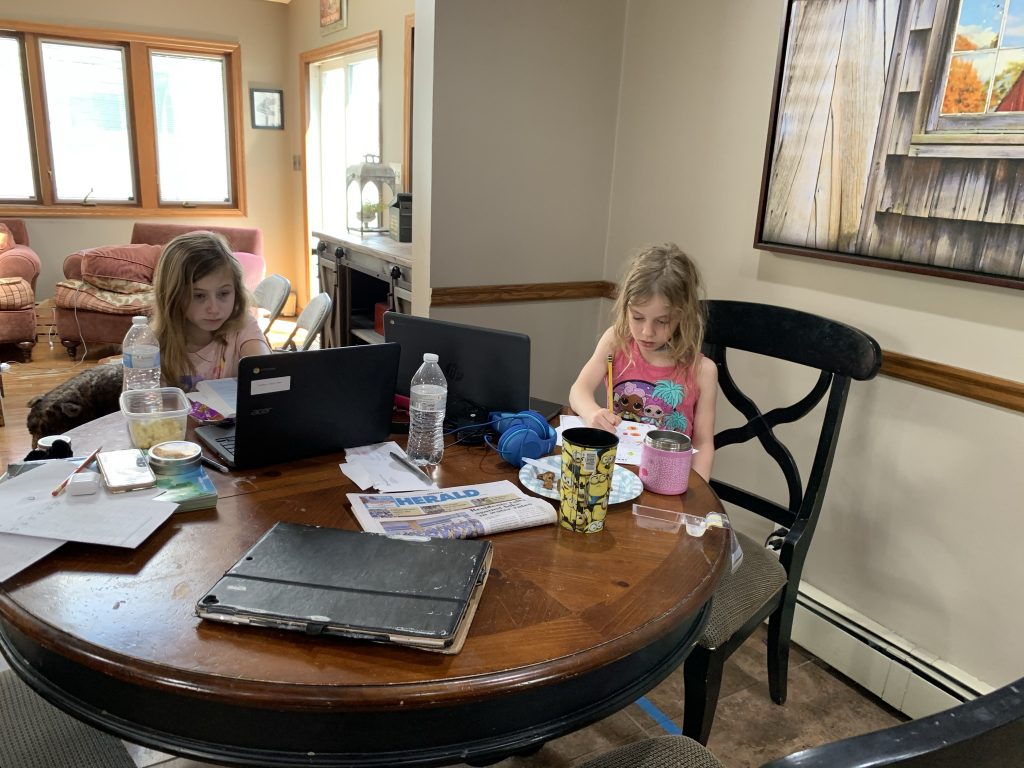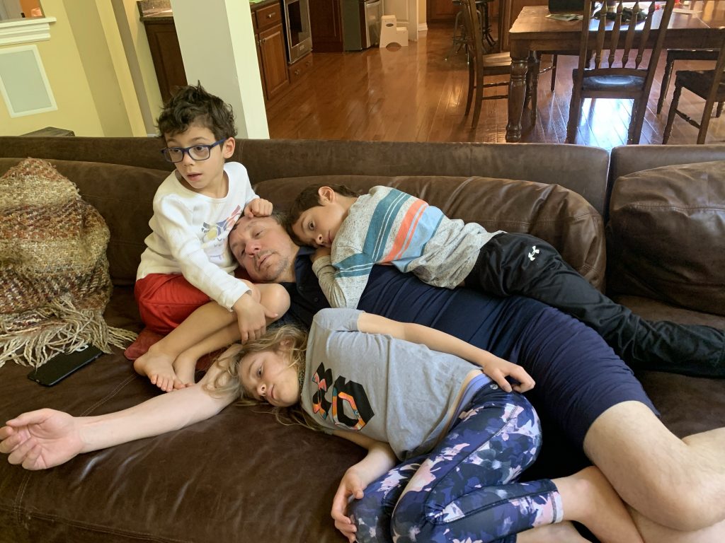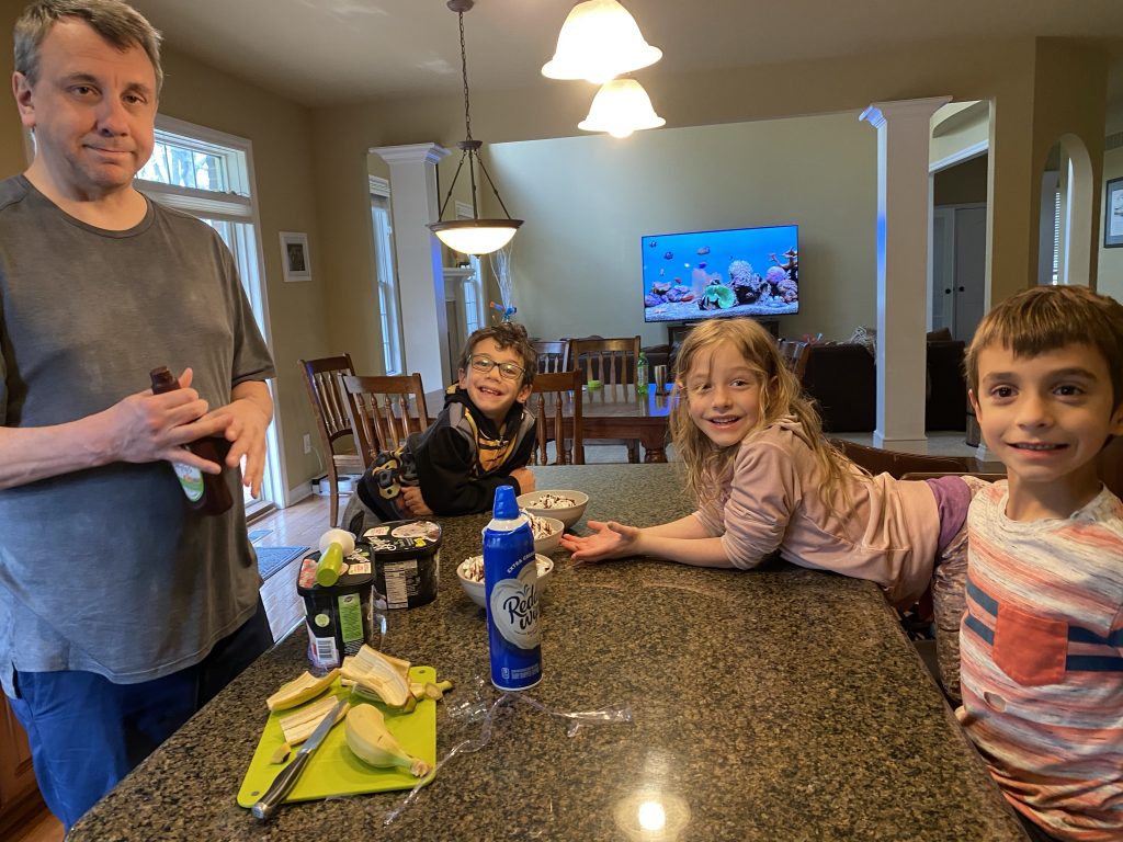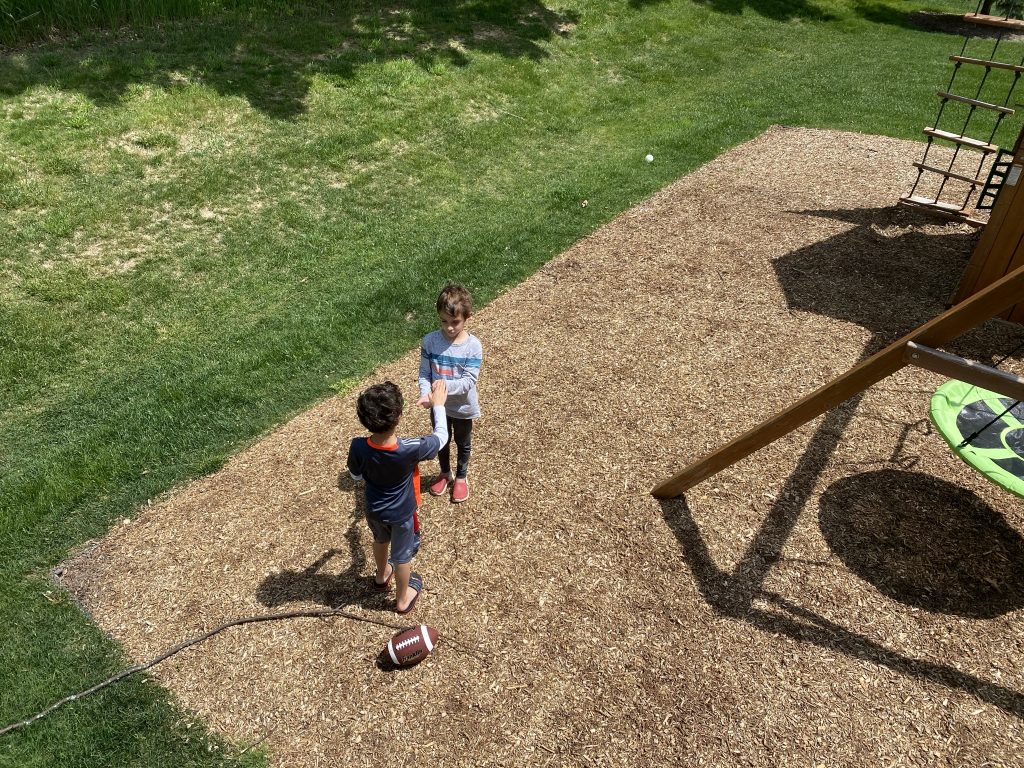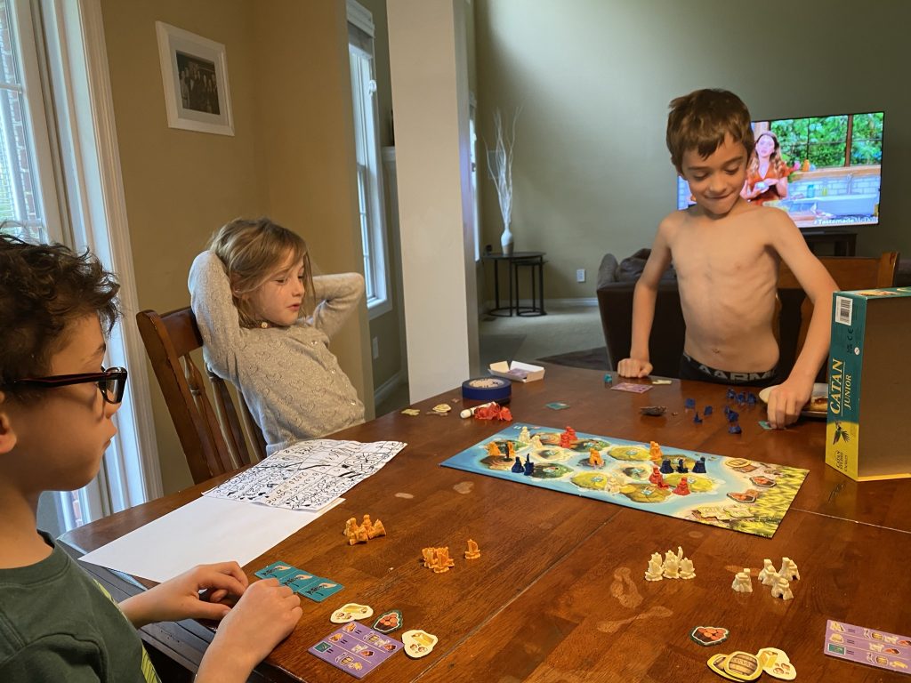 The kids have live PE classes in the house and, sometimes, they do them together. I appreciate the effort on behalf of the school but, honestly, on a nice day I’d prefer to just push the kids outdoors.