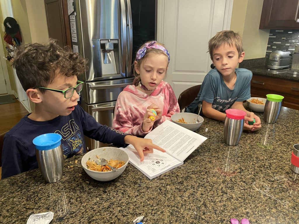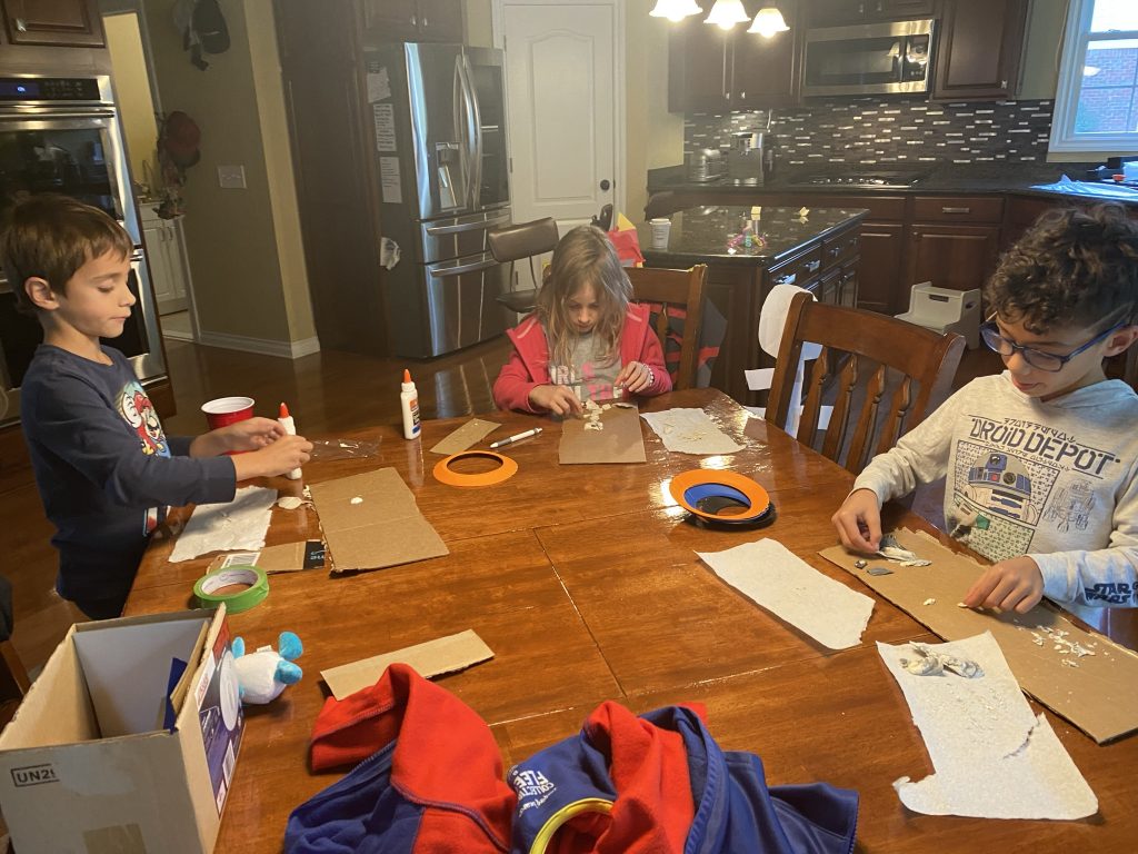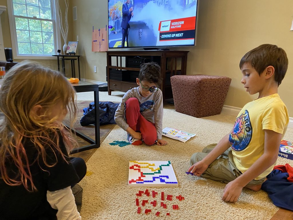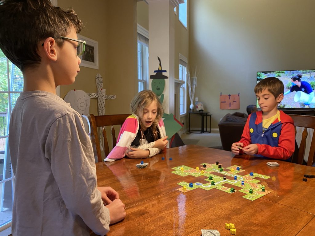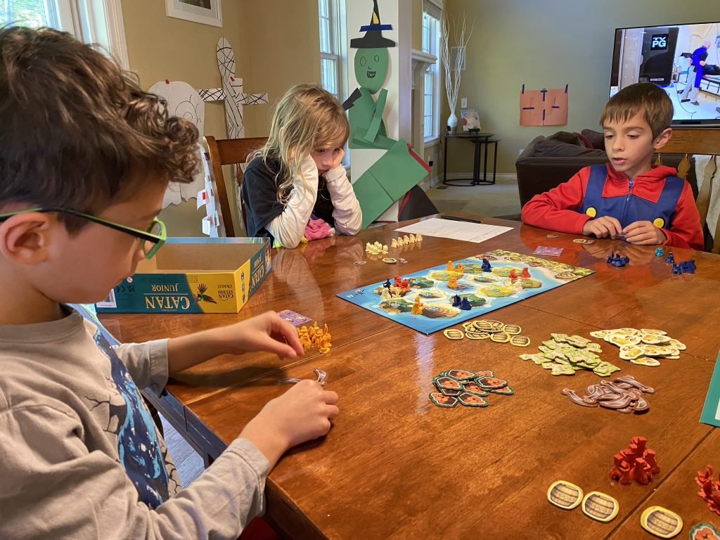 The kids and I had a full game day – with a break in between for my COVID booster. I picked Carcassonne (Steven and Sammy tied). Steven picked Catan Jr. (Sammy won). Sammy picked Blokus (I won). Amaya picked a Halloween board game that she made (Steven won).