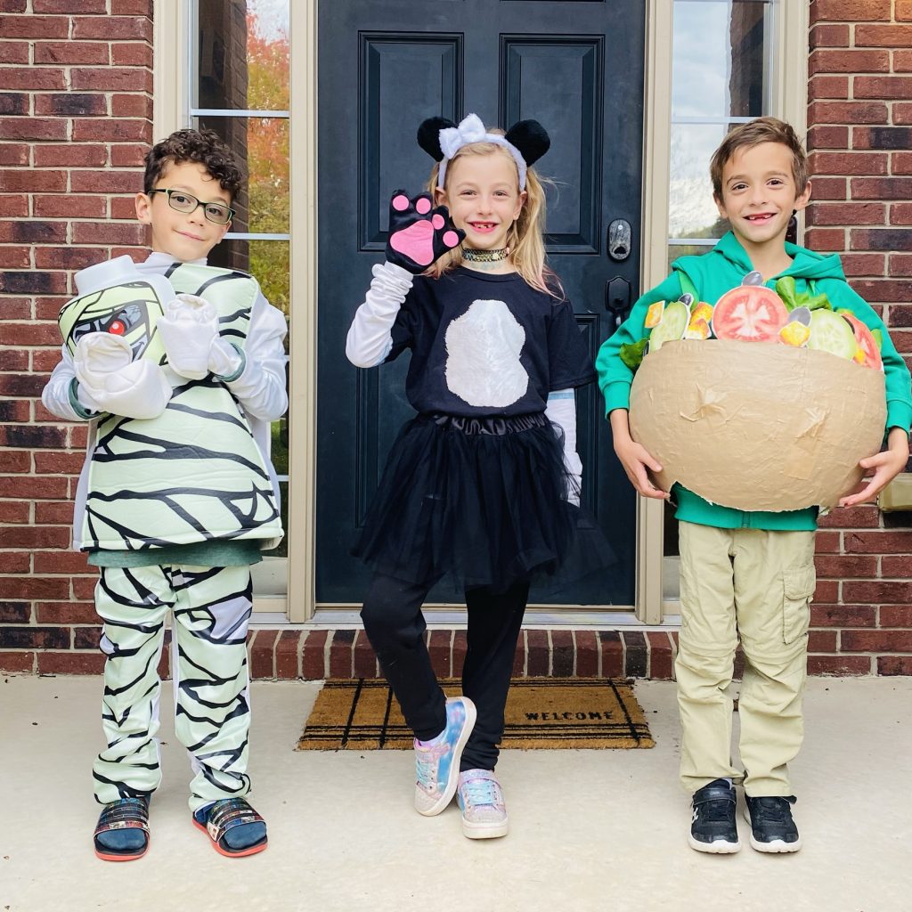 Halloween!! We gave costumes a test drive on Thursday afternoon before the kids wore them to school on Friday. We have Steven the LEGO Skeleton, Amaya the Panda and Sammy the Salad.