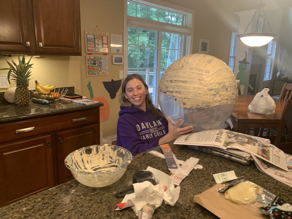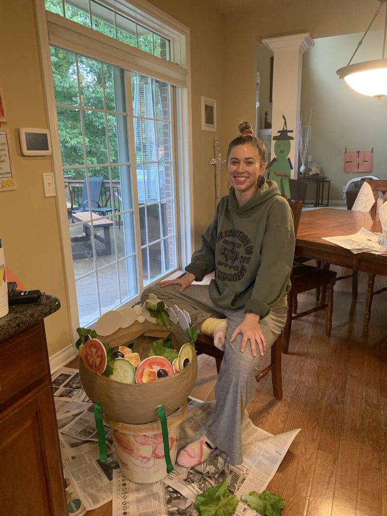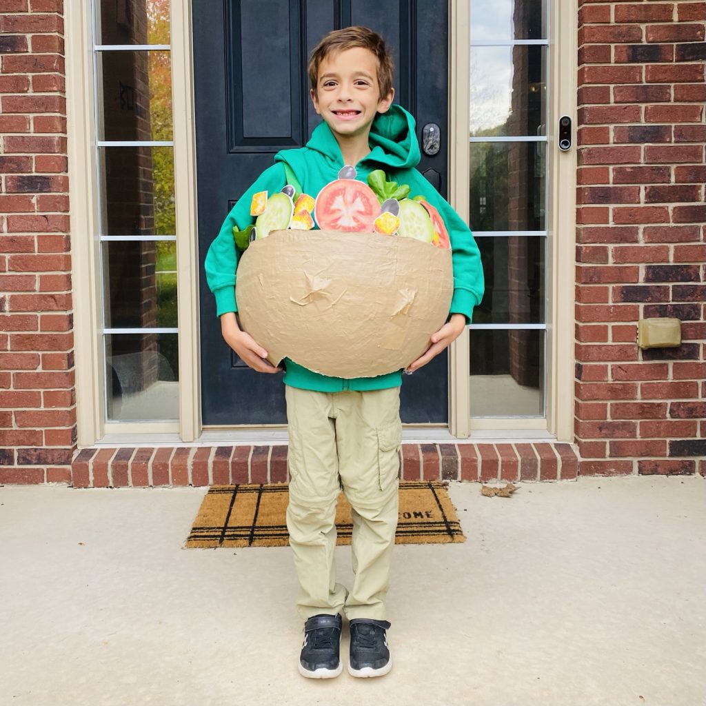 Sophia made this costume for Sammy and absolutely killed it. She started with paper mache around a huge balloon When it was dry, she spray painted it. Next came all of the vegetables, printed and glued to foam board before they were cut. Then the lettuce – looks real! Finally, we added the straps.