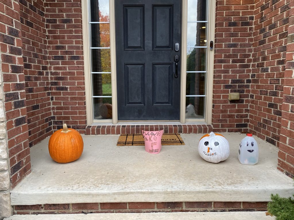 Before we headed out for trick or treating, outside of our neighborhood, the kids got our front porch set up for trick or treaters. The ghost milk jug was a project Amaya did at school. It has a battery operated tea light inside.