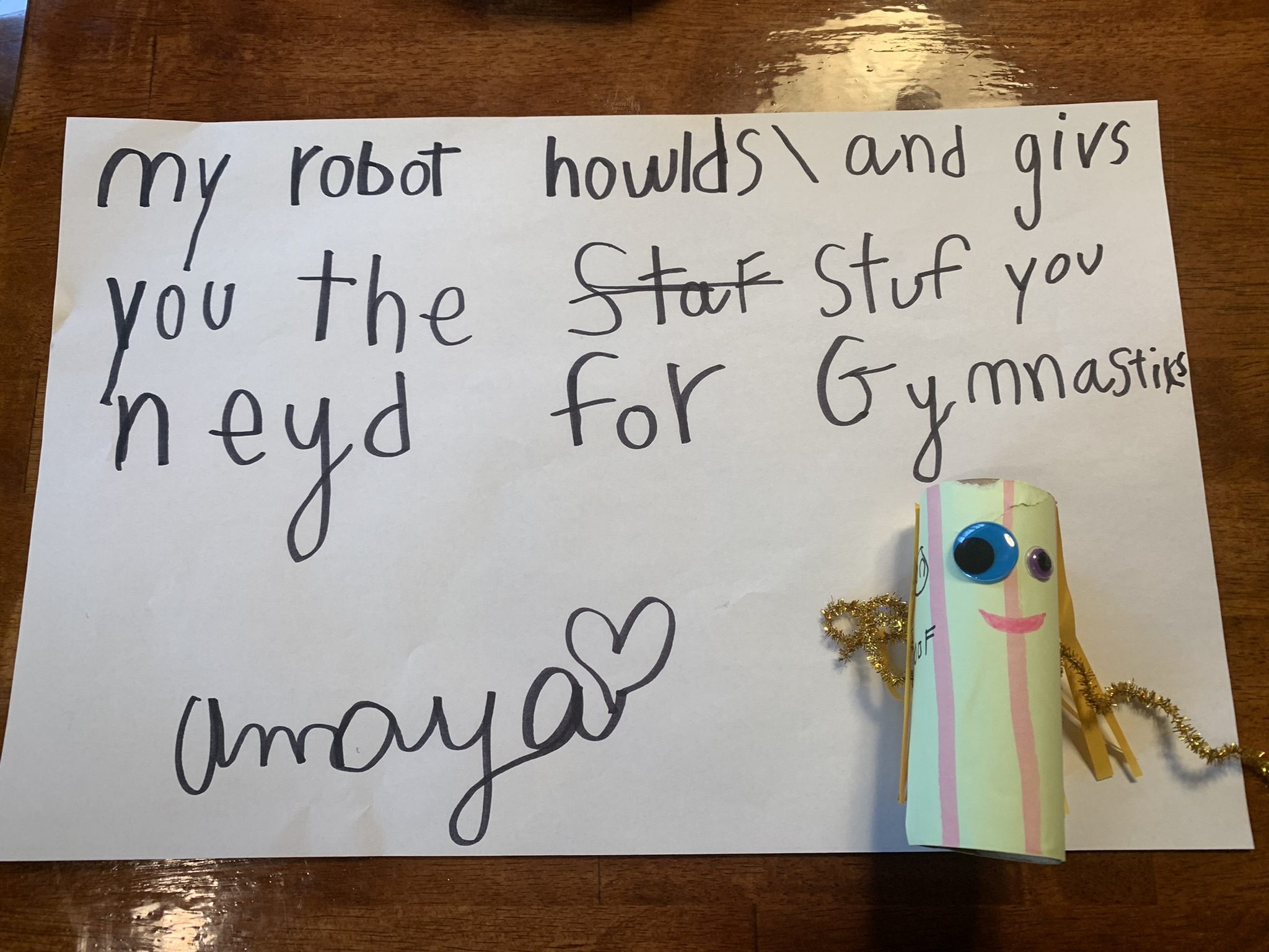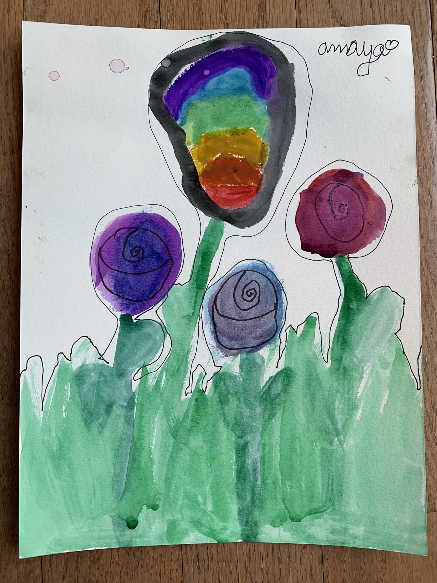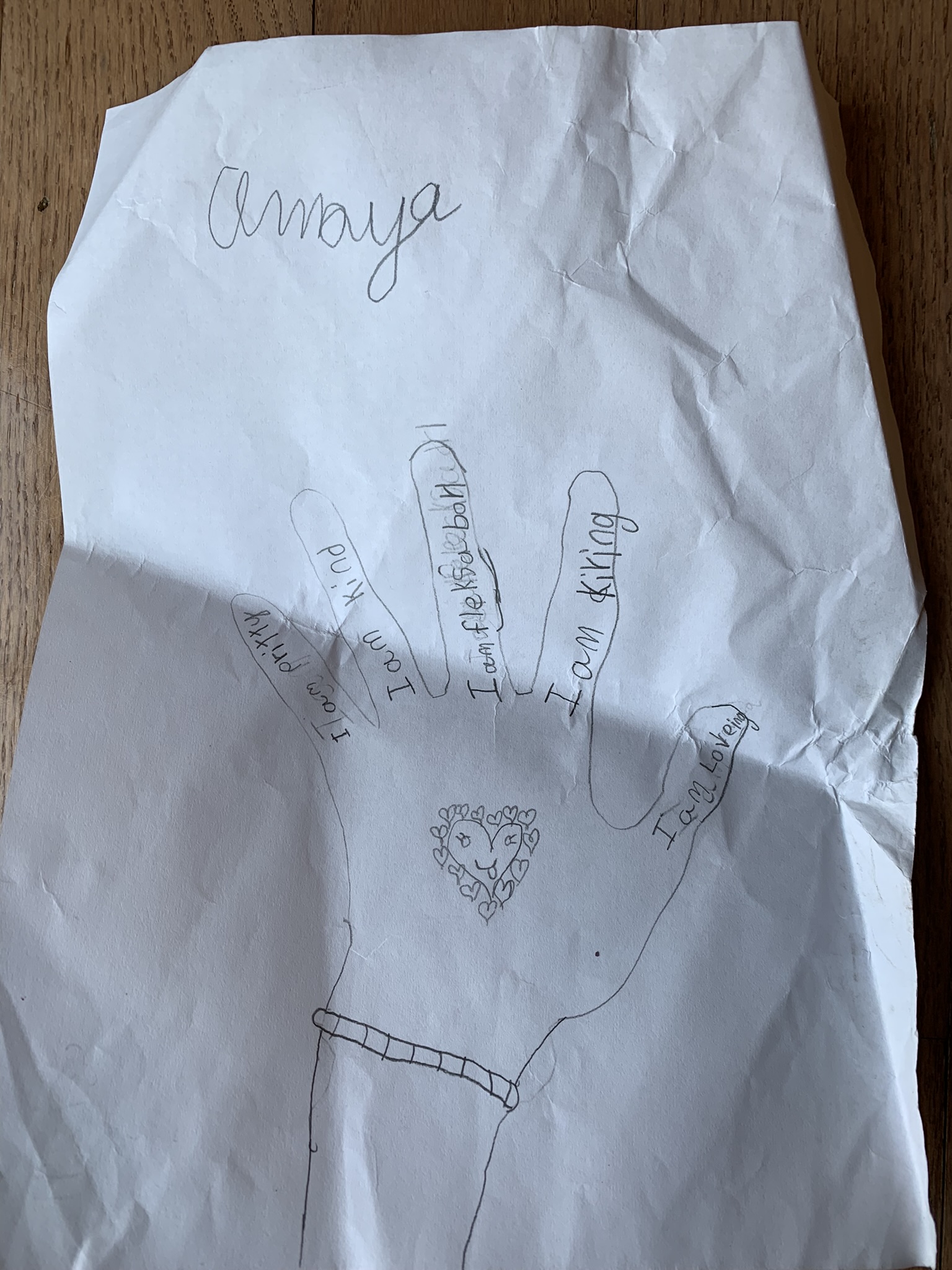 Amaya made this art at school. “I am pretty. I am kind. I am flexible. I am caring. I am loving.” All true!