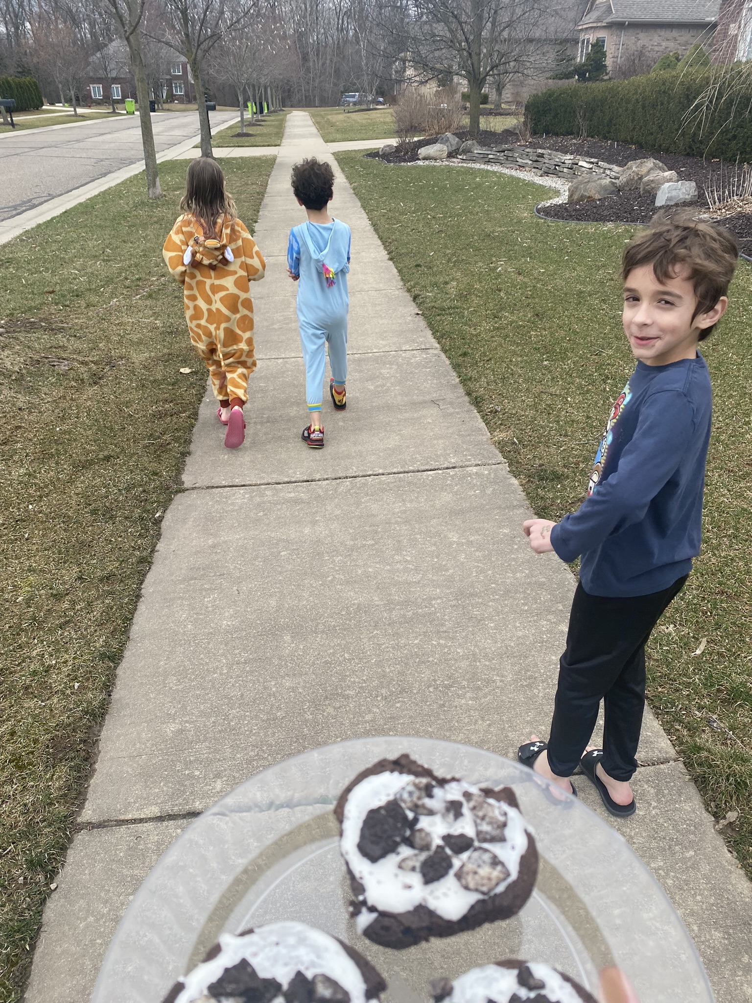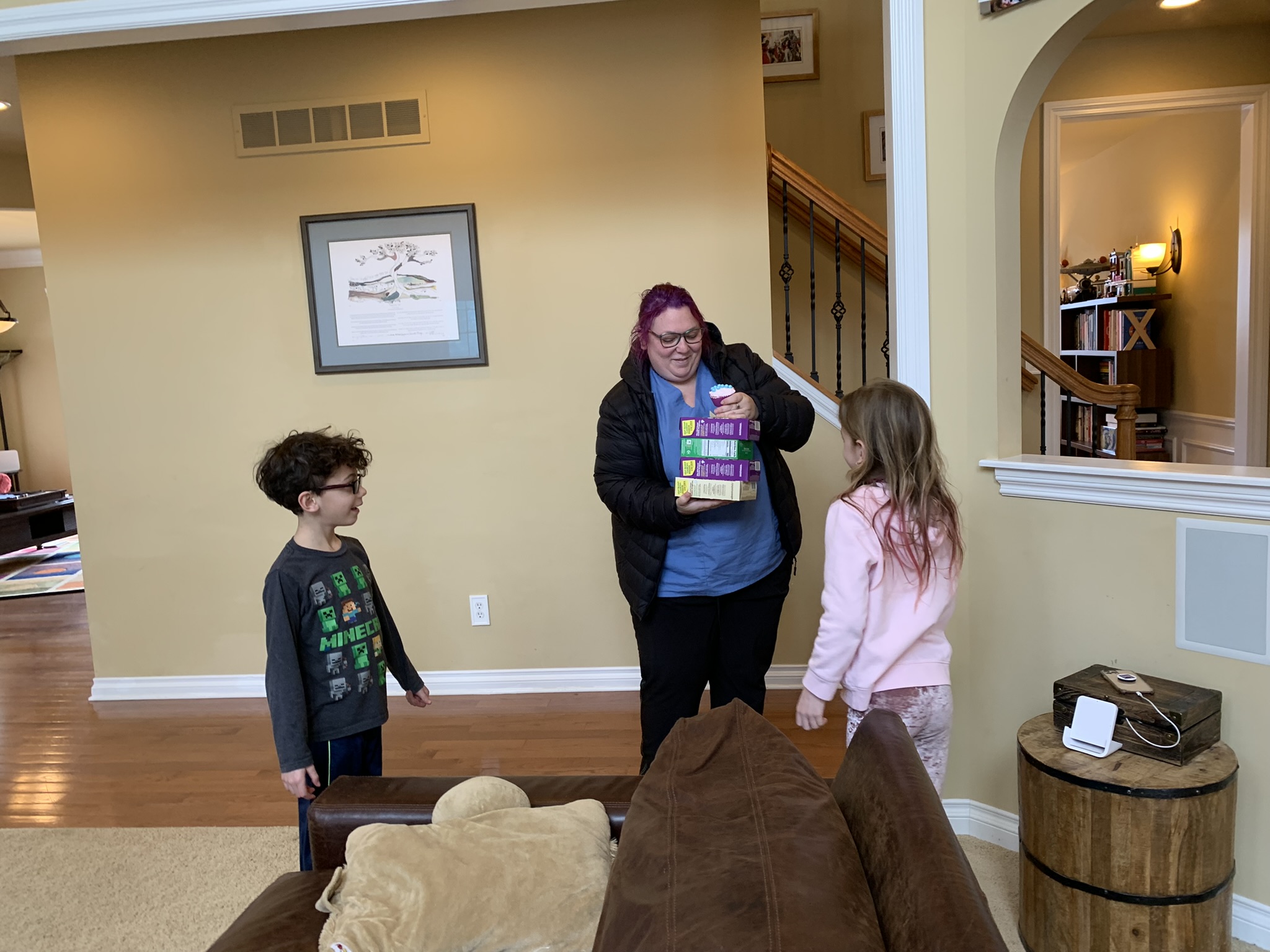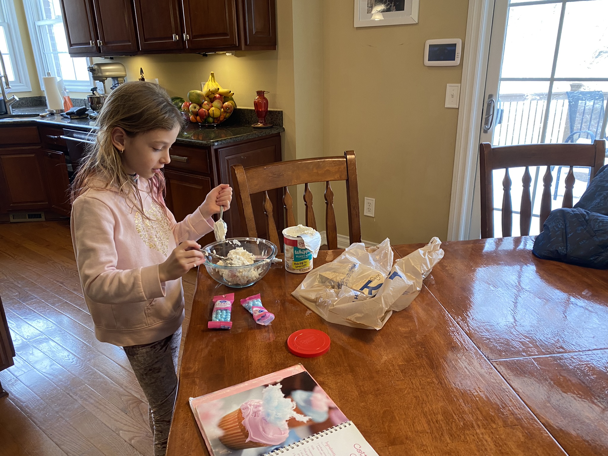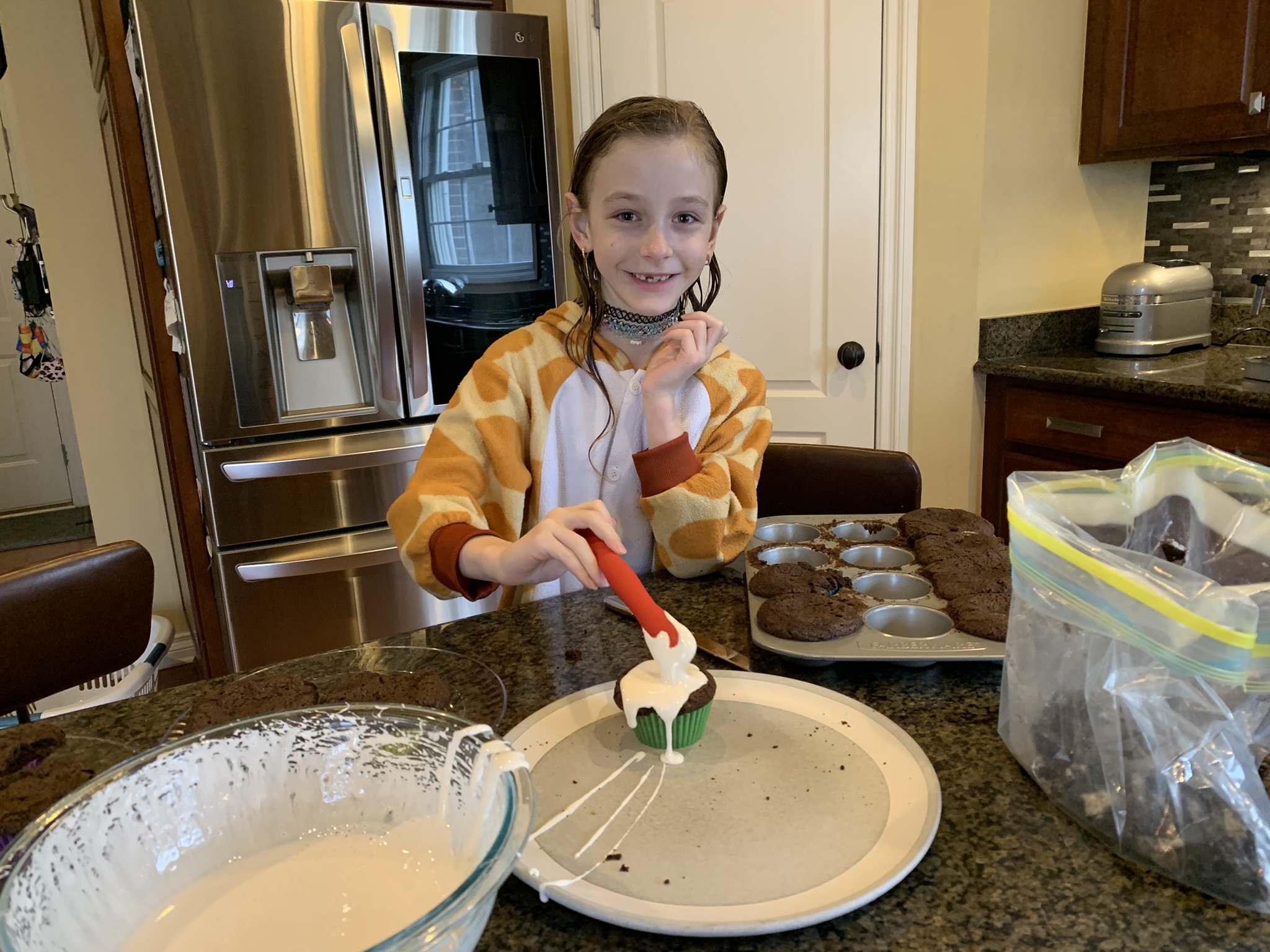 A mom on our block volunteers at the library for Amaya’s class each week. Amaya borrowed a cupcake cookbook from the school library and, while she was taking it out, Mrs. Boomer suggested she bake cupcakes for Mrs. Festa and Nico. So that’s what she did and then hand delivered them to the family.