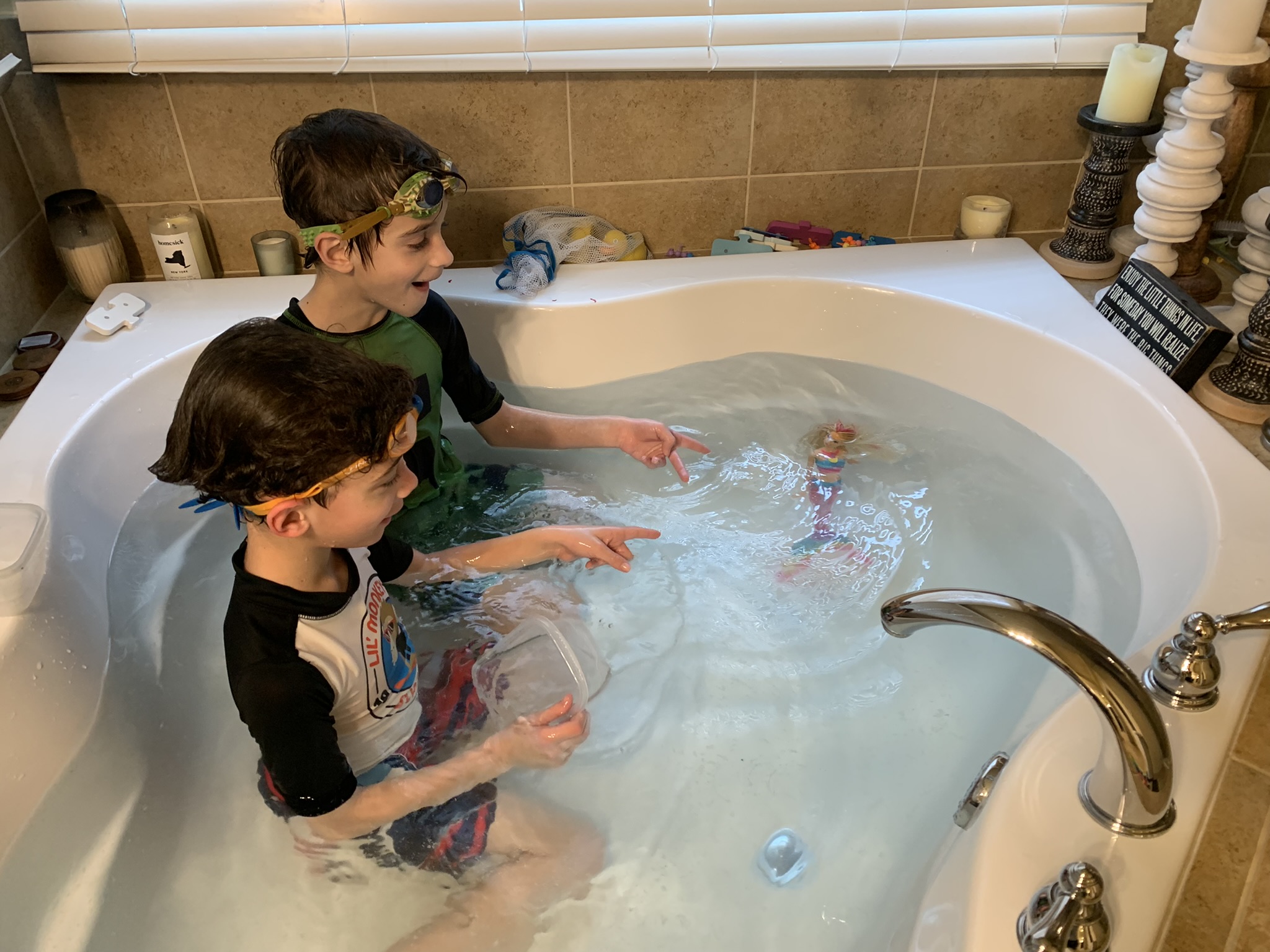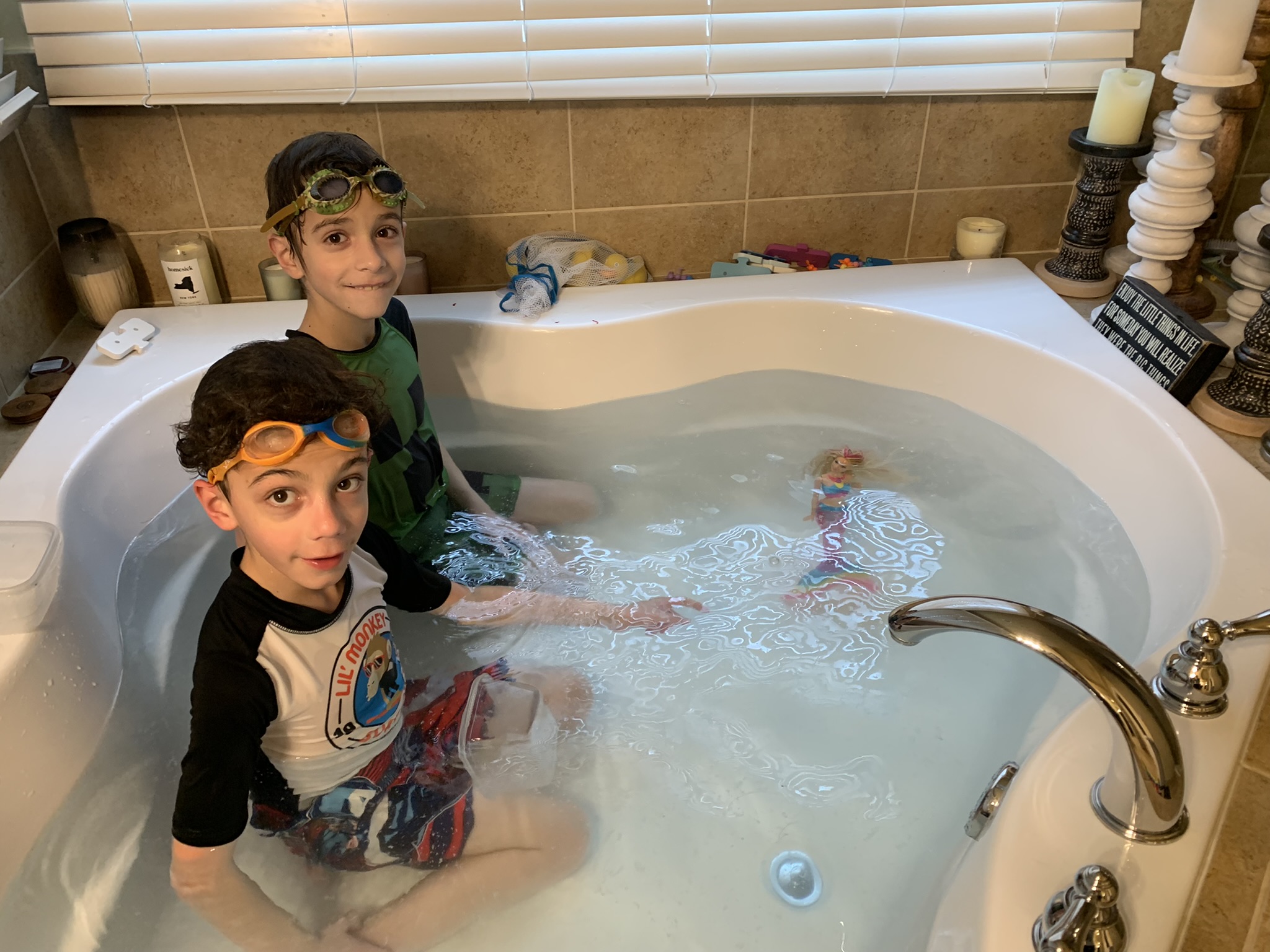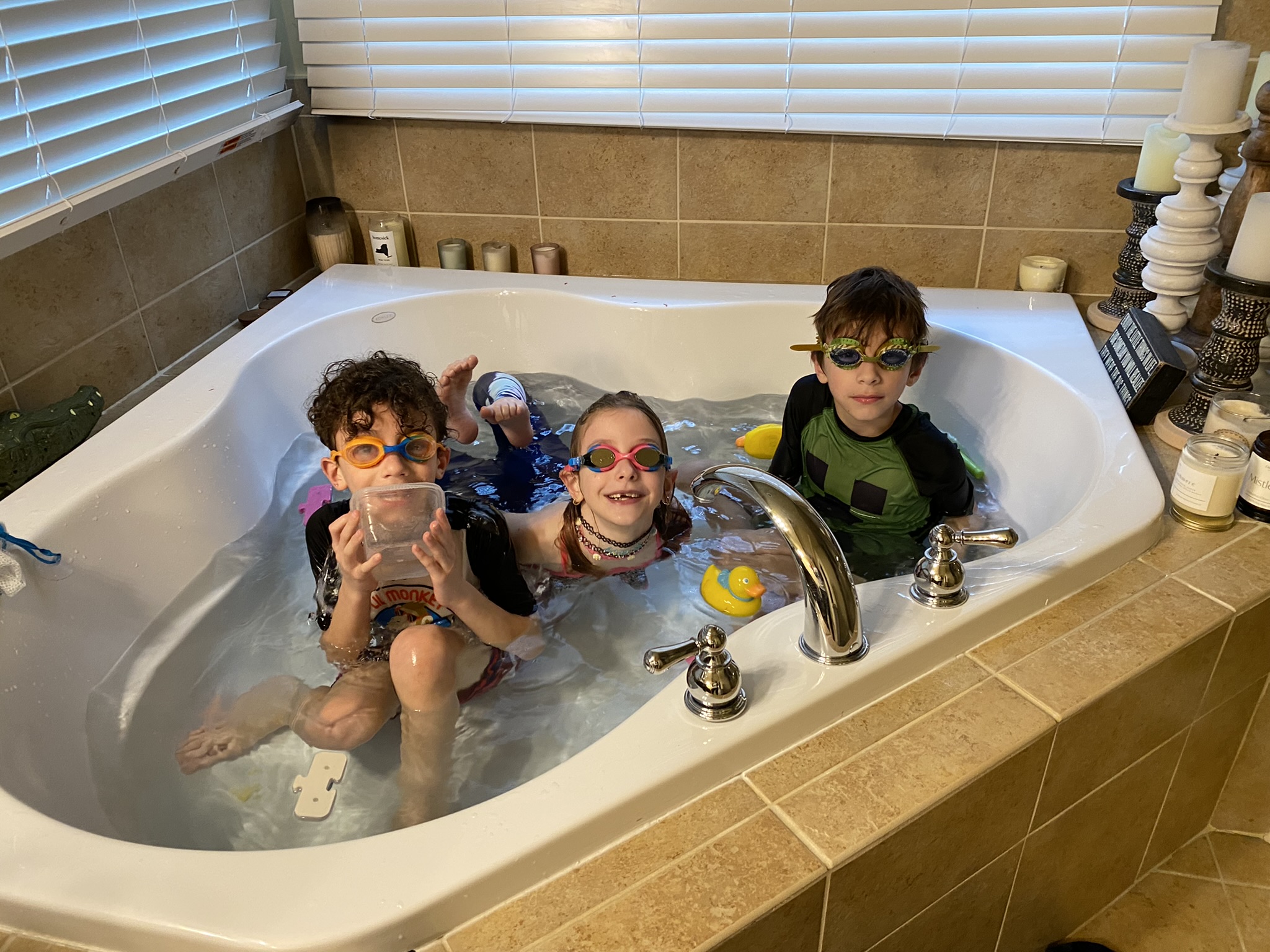 Sammy and Steven had remote control alligators tht they wanted to try in the water which, somehow, ended up with all 3 kids in the bathing suits in our master bathtub. It’s been ages since they piled in the tub together.
