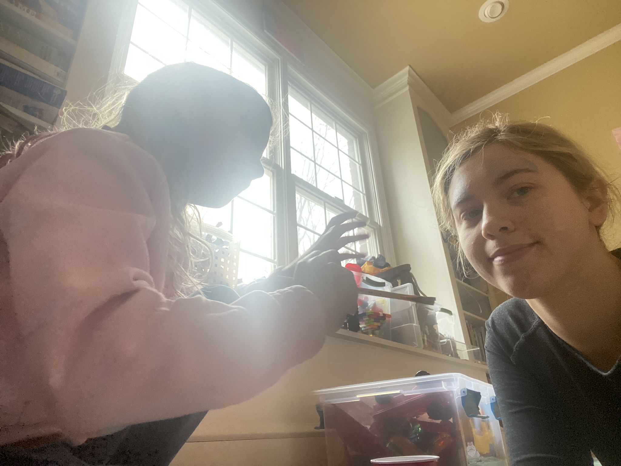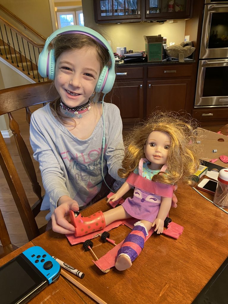 Today Nana came for a visit! Before we headed the the airport we all relaxed at home, which included time for Amaya to finish a project – a wheelchair for her baby Chelsea who has a broken leg.