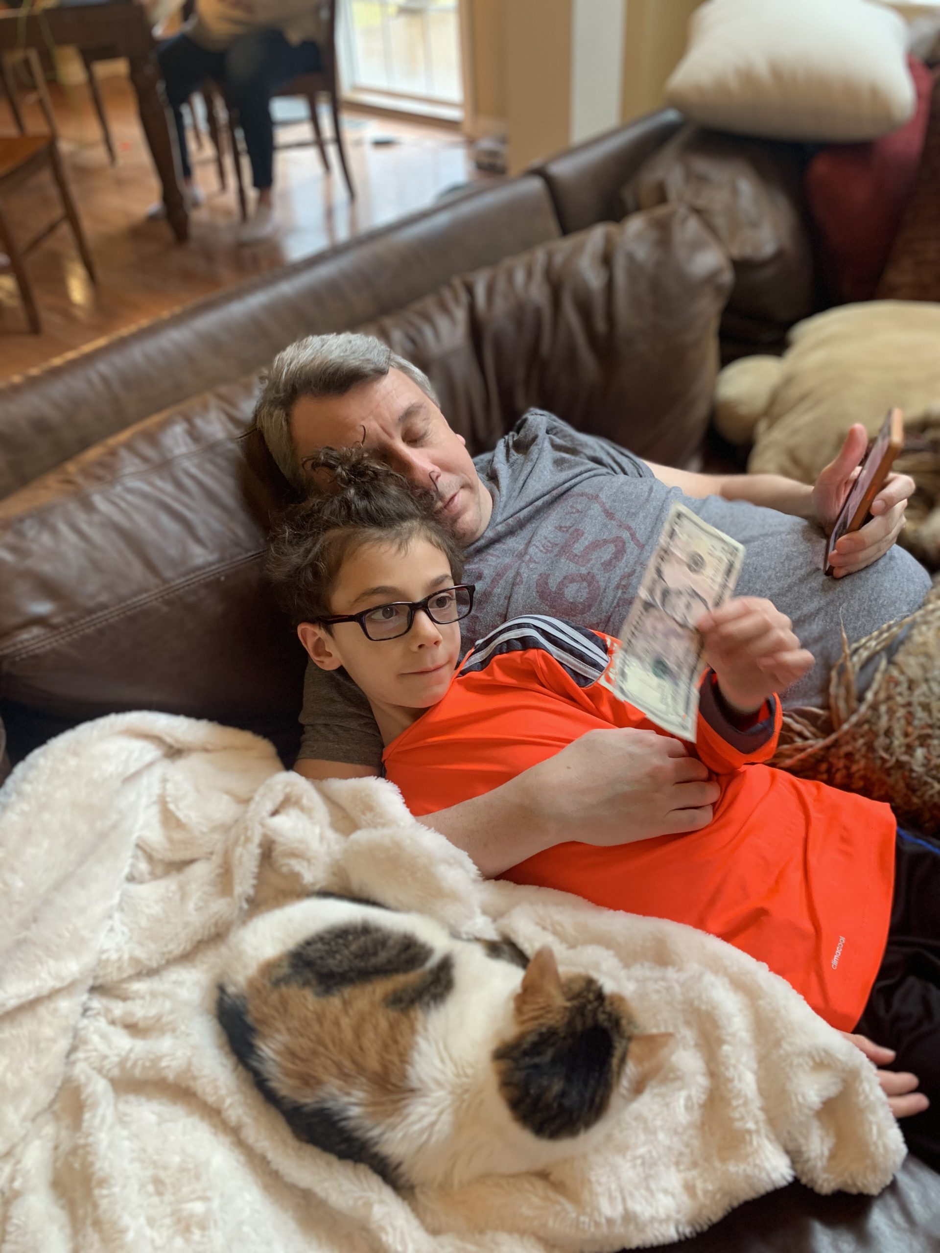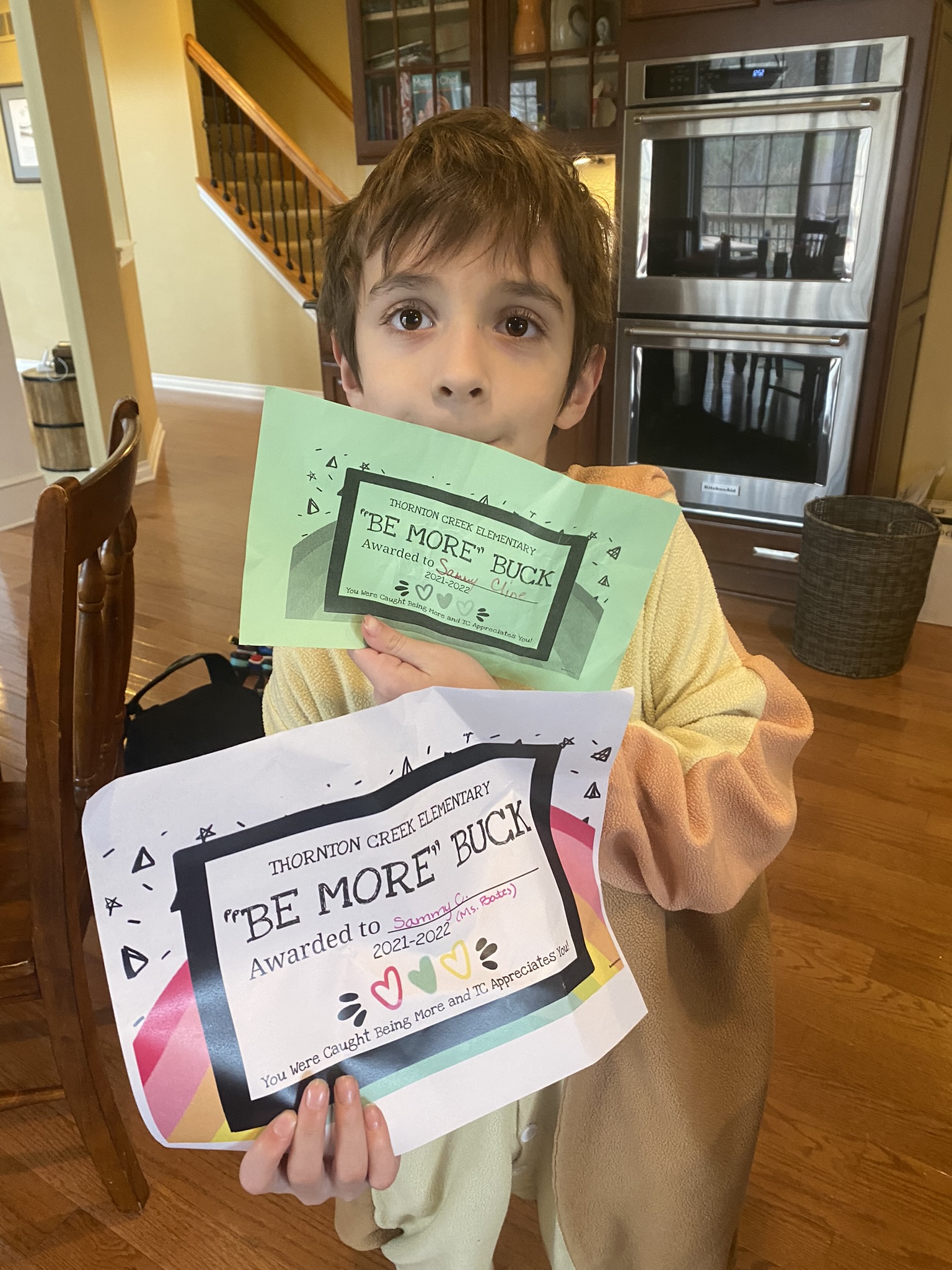 Sammy earned a Be More Buck at school. Apparently he did something kind that earned him the buck (doesn’t remember what) and then his name was pulled from a drawing which earned him an extra certificate, his name on the announcements and possibly something else – but he doesn’t know. 🙂