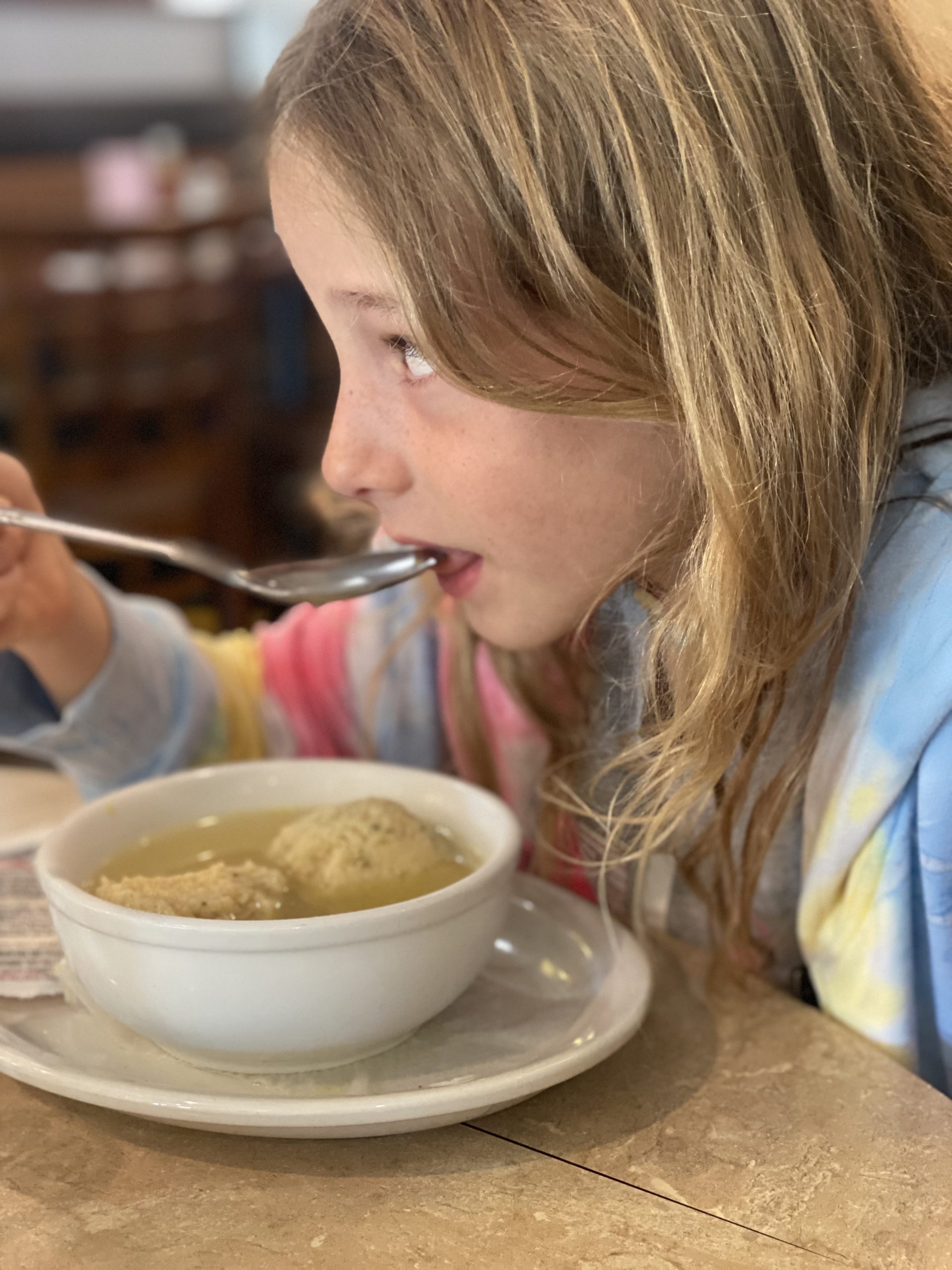On Thursday we had lunch with Gene at Venus. Amaya wanted to go back because she loved the matzah ball soup. When we arrived and were seated, the waitress said hello to Gene and then asked if “these are the triplets” before asking the kids about Michigan. Papa is a regular. 🙂